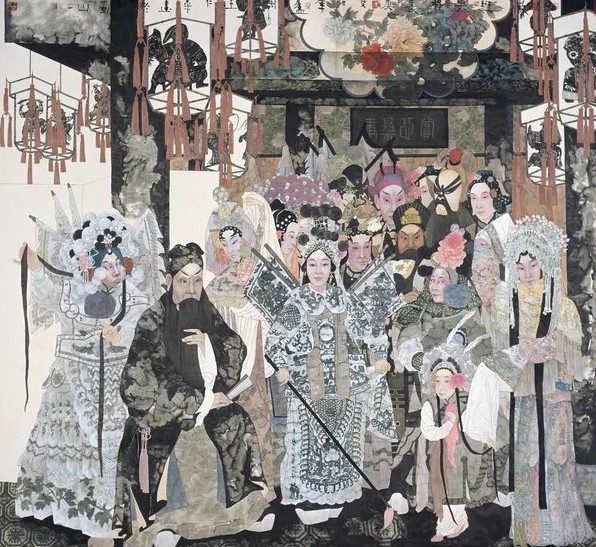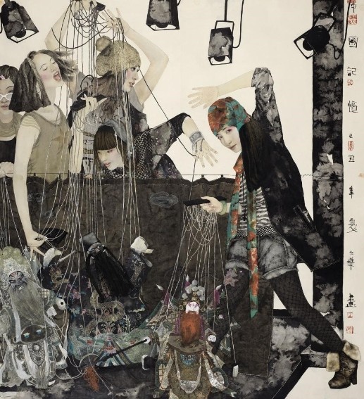 王仁华作品的艺术魅力显然得益于具有当代艺术品质的文化符号挪用。她的画面没有现实场景的再现,那些非现实情节的设计和图像挪用都试图通过非逻辑性而达到深化主题寓意的作用。其画面中的现代女性常常青衣妆扮,让她们穿越在古装与时尚之间,形成画面富于对比性的现实与舞台、生活与角色的变幻,让人难以区分现实人生与舞台角色之间的界线。但这些具有文化符号特征的图像挪用与集合,实际上呈现了主题表达的模糊性或宽泛性,而这正是当代艺术图像隐喻的共同特征。