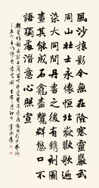 “腹有诗书气自华”,李承孝笔墨中的这份文人气,源于他多年的学养积淀。他于经史子集多有涉猎,于诗文书画广有浸润,把典籍中的哲思、诗卷里的意境,都化作了笔下的底蕴。笔墨当随时代,却也当守文心,承孝先生的书法,正是以传统文人的精神底色为骨,以经年累月的笔墨锤炼为肌,才生出了这般不疾不徐、不躁不浮的雅韵。展卷细品,仿佛能看见他临帖时的专注、创作时的沉吟,能感受到他在笔墨间安放的从容心境,以及那份根植于中国文人内心深处的精神坚守。