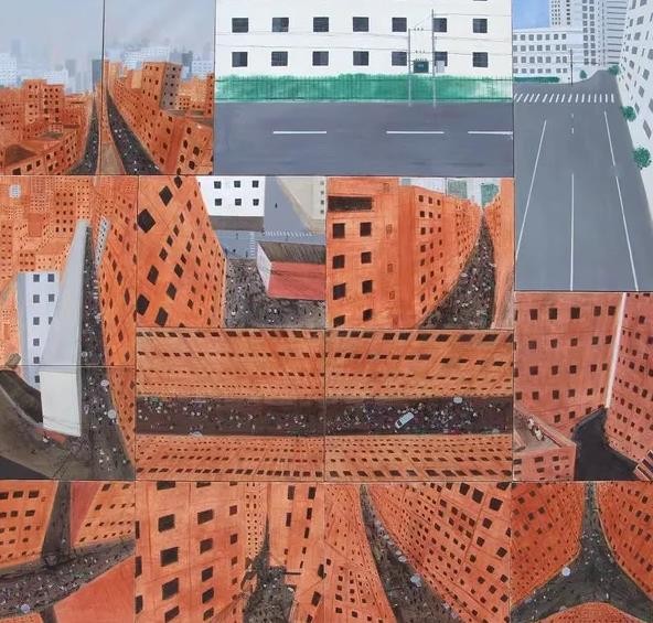 话说回来,韩克伟就是这样一位“介入的旁观者”。他所构建的视觉图像,就一直在展示着自己独有的身份,一方面,他是旁观者,冷静,客观,另一方面,他又是介入者,热烈,主动。他的构图与构色,就是在这二者之间维持着微妙的平衡,并因此创造出独特的视觉体验。他所描画的城市生活,他所讲述的人与城的故事,就是对当代处境的最生动的表述。韩克伟想反复告诉我们的就是:你已经无法离开城市,不管它是压迫性的,还是让你自由;不管它是欢迎你,还是拒绝你,你都必须置身于这一庞大的存在中。从韩克伟作品中那些被反复排列的楼房,被不厌其烦的连接起来的窗户中,你会看到以复数形式存在的人、人群、人海。韩克伟所讲述的恰恰是一个人类历史不容被忽略的社会现实,这就是改革开放以来中国的现代化。现代化某种意义上就是城市化,而城市化的背后又是庞大的移民浪潮。从乡村到城市,从故乡到异乡,这样浩荡的人口迁移,你说像蝼蚁也好,你说像愚公移山也好,就这样,城市像一个阿里巴巴的神奇口袋,装满了形形色色的异乡人。人越来越多,越来越密集,楼也跟着越来越高,越来越像山一样地扑面而来。从镇到城,再到大都会,我们就这样想象城市,遭遇城市,并且进入城市。