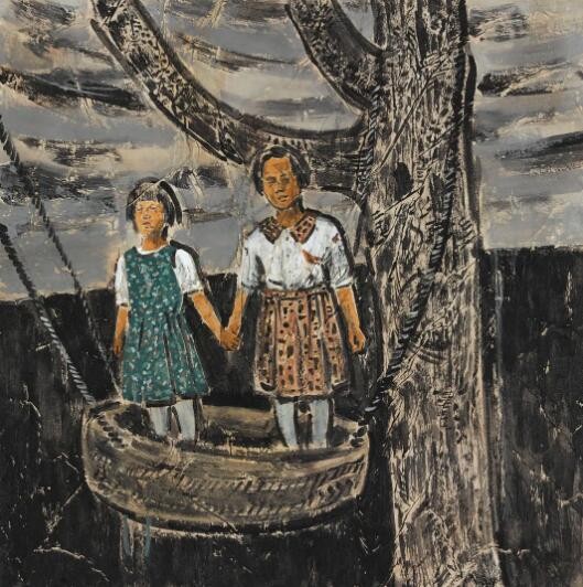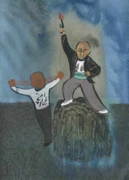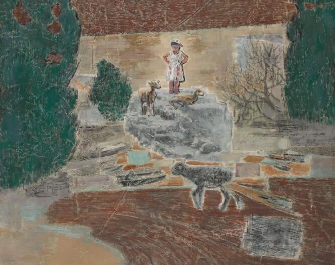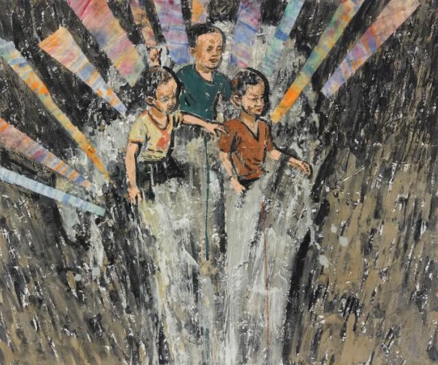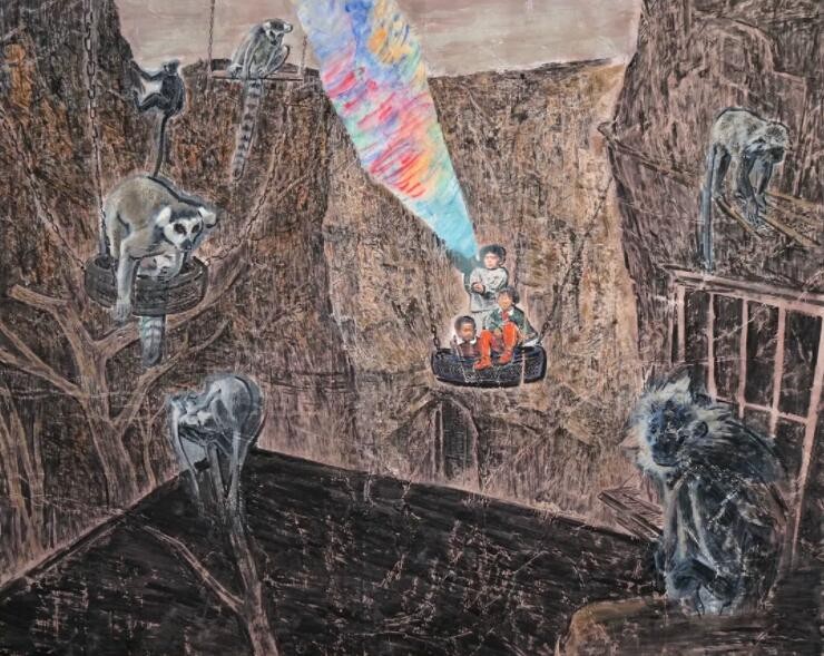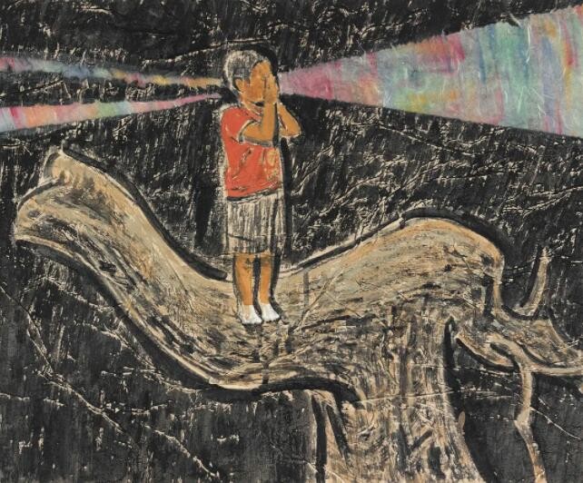 当下艺术的发展愈来愈转向于对个体或族群生命体验的呈现,而放弃了完整的叙事情节,这种现代性审美的转变使得艺术家可以挖掘不同的角度表达自我。郝龙的作品基于童年照片的记忆,表现了对当下社会聒噪、潦草,甚至怪诞的思考。在郝龙的绘画当中,儿时的记忆仿佛被至于无垠的旷野当中,又仿佛在广阔的宇宙中间。这些碎片化的记忆,既是对旧时光的追忆,也是对当下境遇的一种宣泄。而艺术家诙谐的表现方式和画面上天真稚幼的形象,又暗示了某种妥协,某种合理且乐在其中的妥协。稚拙的笔触与色彩、错乱的记忆时空、荒诞的想象,这些因素构成了艺术家独特的生命体验,也完成了他对过往略带集体主义情愫的怀念,这其实折射了青年族群在社会变革和城市化的过程当中所面临的心理境遇。“万兽之王系列”是艺术家在疫情期间的创作,它借喻儿童作为“万兽之王”的情节,讽刺人类在世界中不切实际的想象。人类妄图完全解释并且改变这个世界,这种想法就如儿童站在假山上发号施令一样,可笑而荒谬。而包括动物在内的外在世界却置若罔闻,无时无刻不在按照原有既定的规律运行着,儿童的“自娱自乐”是一场游戏,成年人的行为何尝不是如此呢?艺术家试图提请人们重新思考人与世界的关系,重新理解权力与义务之间的关联。
