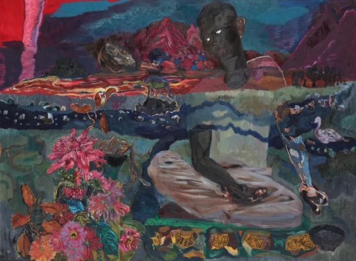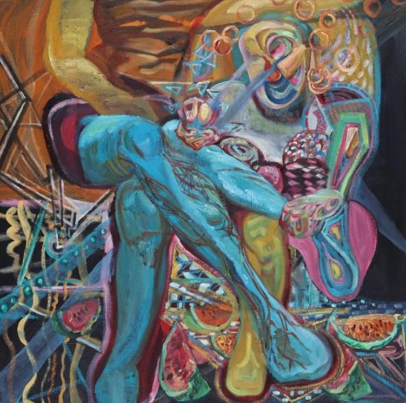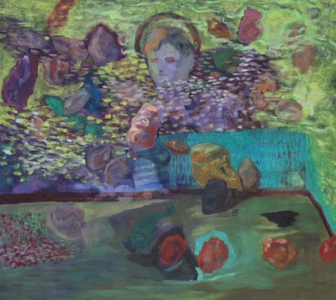 又好像朱塞佩·阿尔钦博托,看见他的作品时,先是愣在的原地出了神的盯着眼前《四季系列》中的两张作品,思考它究竟是肖像还是蔬果、花、树、鱼等静物。显然两者皆是,也可以两者皆非。这就是一种与动物在自然环境中隐匿的法则相似的融入作品的一种方式,这种“复合式形象”模糊了主题和周围环境之间的界限,还有的可能更为直接,直接用线条与颜色来让本来应该是画面主体的部分悄无声息的在你的眼前消逝。
