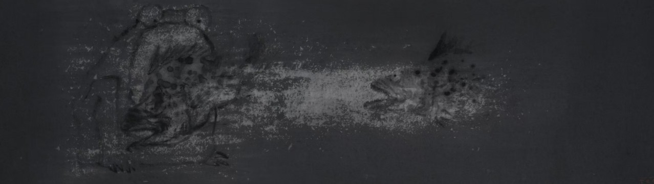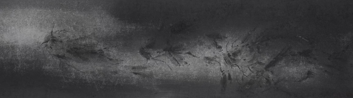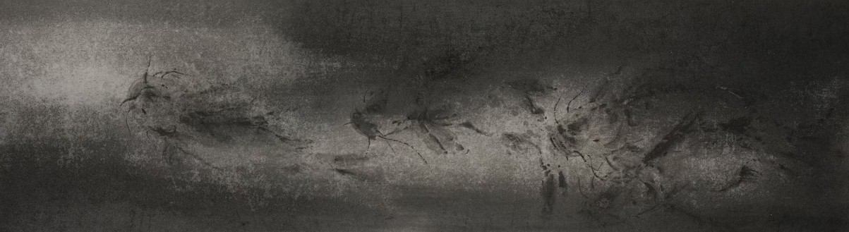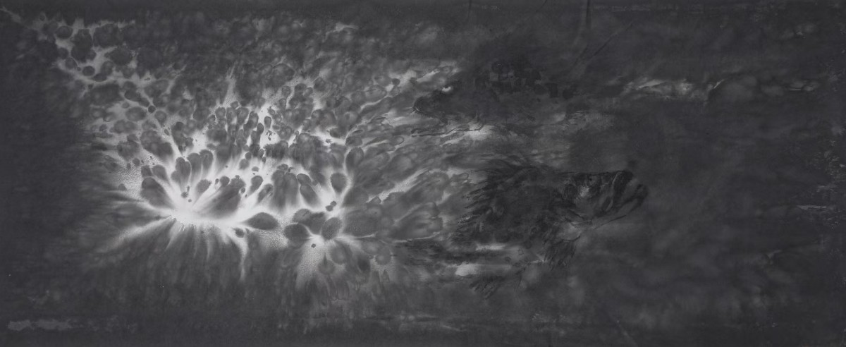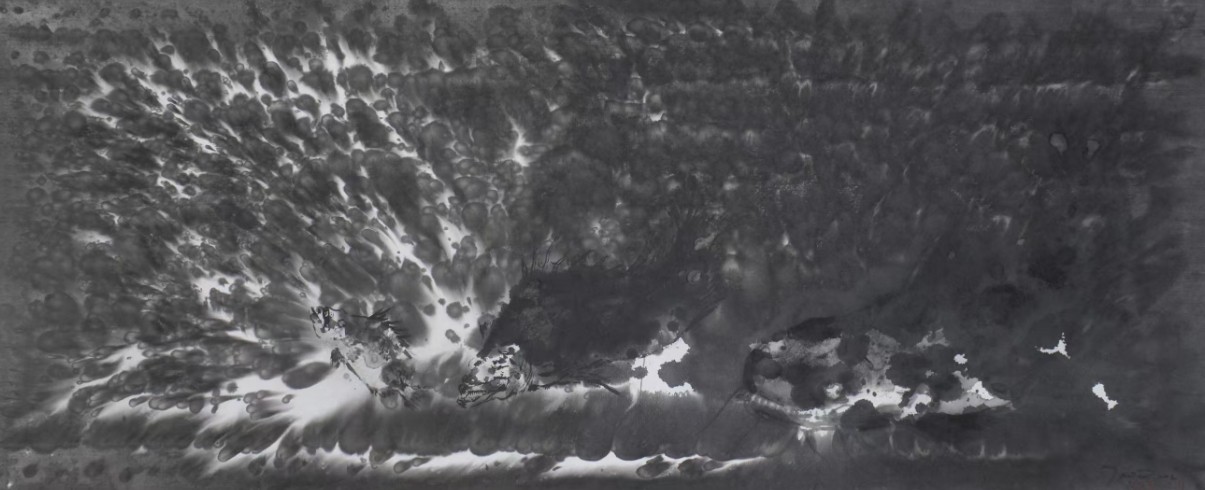 疫中闭关,创作仍在继续。一次偶然,墨泼洒在已画好的鱼群之上,鱼影几乎隐匿。陶醉在焦虑中反复以水冲洗画纸,层层晕染、缓缓渗透……渐渐地,鱼影再度浮现。这一次,它们不仅“活”了过来,更仿佛挣脱了水的束缚,游弋于宇宙流光、天地呼吸之间。画面由此生出一种超越现实的灵性,鱼成为光影,成为气息,成为时间本身。