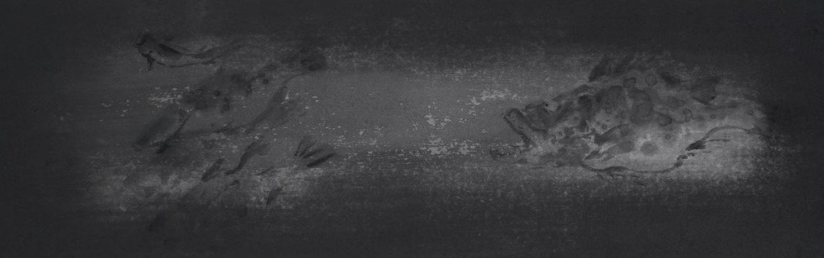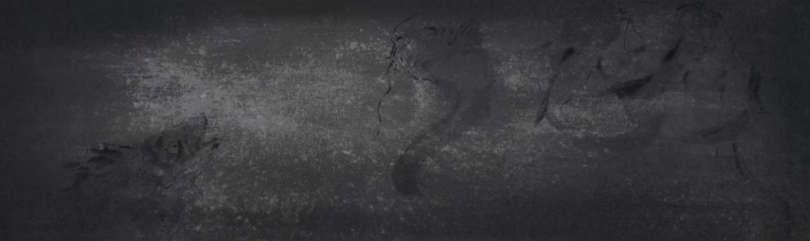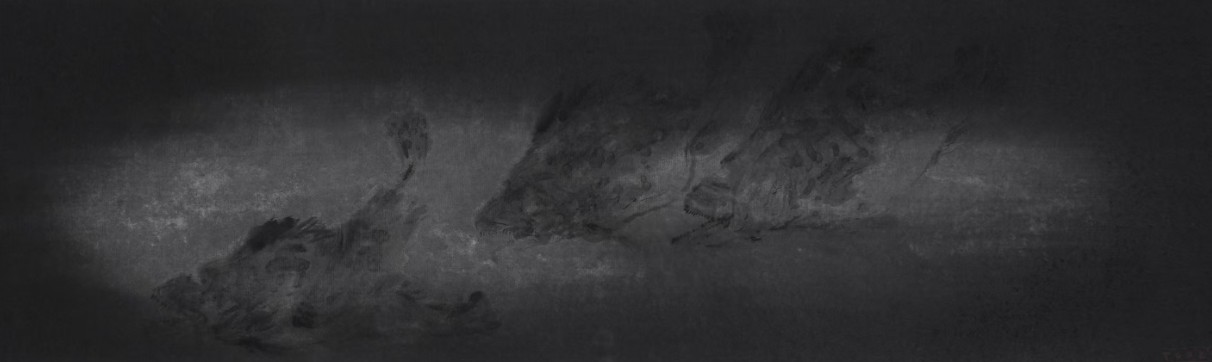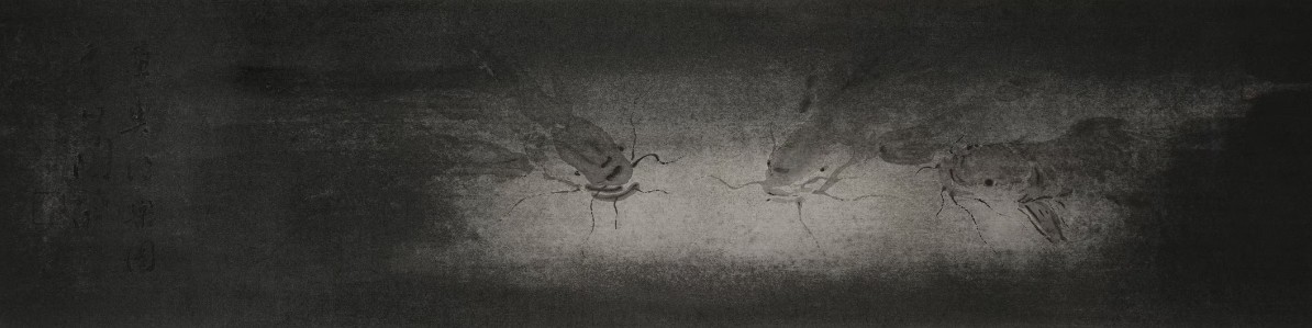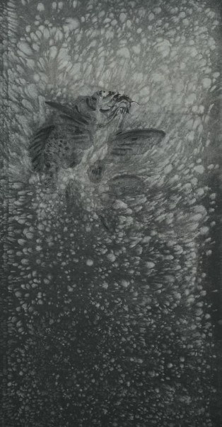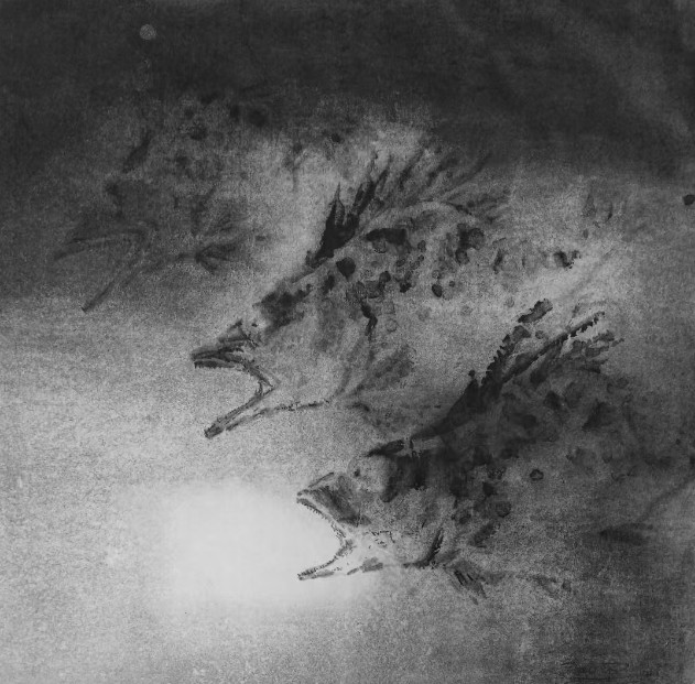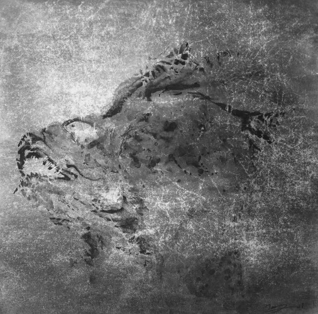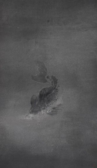出于生存与存在的双重自觉,陶醉开始画鱼。他先养了一缸鱼,日日观察其姿态流转、动静生息。然而,如何将那一瞬的生动转化为纸上的生命?他从传统“五笔七墨法”中探寻资源,最终在宿墨中找到了答案。宿墨脱胶遇水,于宣纸上自然渗化,形成斑驳的痕迹与丰富的灰度——那灰度通透且层次微妙,超越油画灰调的质感。陶醉借助宿墨的斑驳,留存了时间的印记;又通过墨色如玉包浆般的透润,完成了时间的超越。至此,鱼不再仅是水中的生物,它游进了宣纸,并在墨韵中获得了持久的生动。