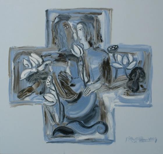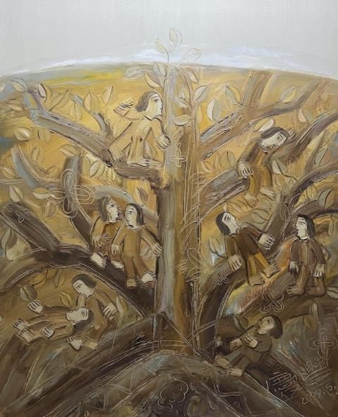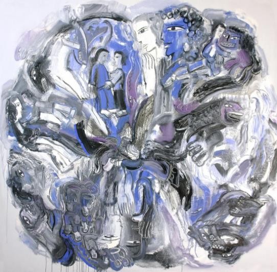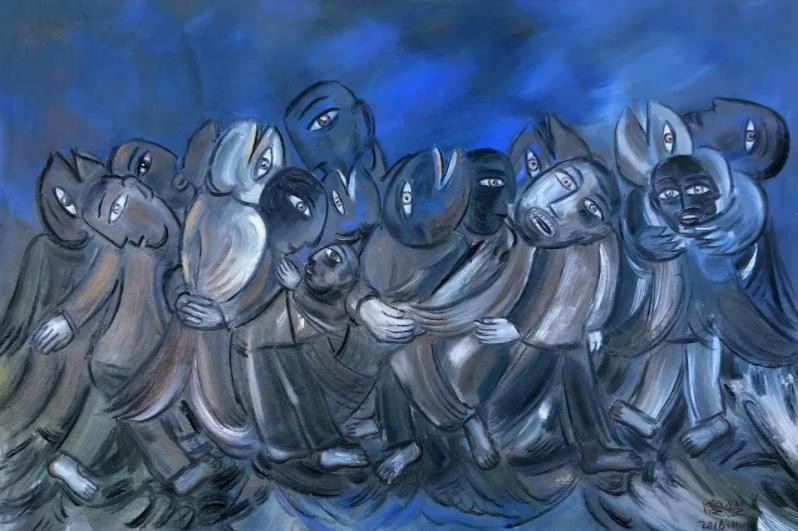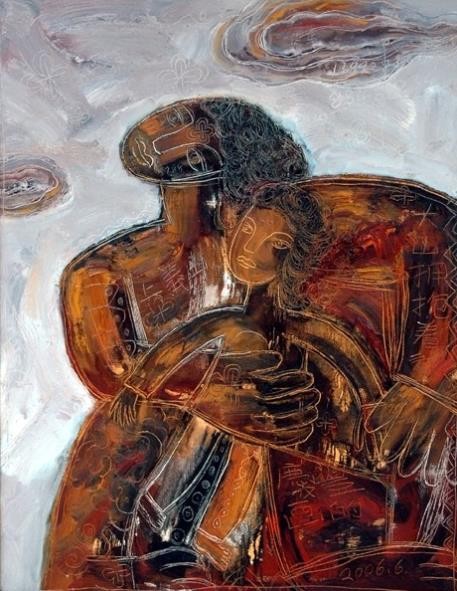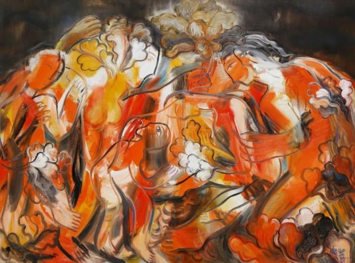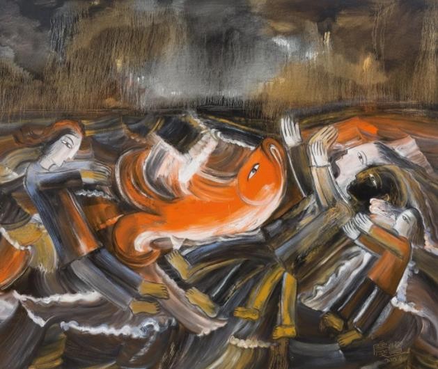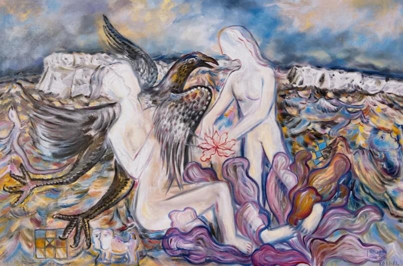 欣赏郭庆丰的作品时,很难不为他笔下炽烈原生、生机恣肆的情感力量所触动。贾平凹曾评价郭庆丰是“熟知世界美术史,文艺修养很好并且要追求学术的艺术家。他本身具有幻象特色的绘画并未止于民间特色,而能在更高的角度来表达更加神秘的象征和寓意……庆丰的油画山海相连、身体与灵魂生生不息,色彩诡异艳丽,诸神充满、界破虚实。”在郭庆丰的作品中,现代中国人与古老的河山故事紧密相连——既回溯过去,又通向未来。