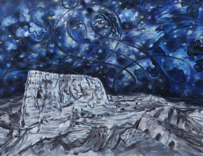 黄河流域多元的文化孕育出这片大地上纷繁复杂的民间信仰。在陕北原始宗教文化中,天地草木,万物皆灵,寄托着先民心中的敬畏与渴望,艺术便成为了人类呼唤神灵的媒介。郭庆丰的作品展示出人类精神世界与自然生灵的交流与融合:夜空是缀满繁星的锦缎,魔力一般混沌弥漫于宇宙之中;匿于山海间的神灵悄然睁开眼睛,神话生物行走大地上、翱翔于天际,古老的巫术符号似乎传递着某种神秘的信息……在物质的时代,艺术家拿起画笔,虔诚地描绘着肉体之外、物质世界之上的精神归属。