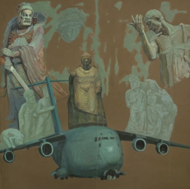 图像理论中的图-底关系一直都是学术讨论的关键问题,在余学民的很多作品中,图像与图像背景构成了新的句法关系:艺术家通过图像背景的剥离,将本具有强烈文化属性和符号化的图像悬置在未知的时空中,或放置于异质的文化语境中,从而加强了图像的超现实感和时空错乱感。在跨文化的图像语法中,图像的强度至关重要。在风格上的模仿往往无济于事——艺术家的手是绘画图像强度的直接作用力,但如果被过度智性思考左右的手描绘出的图像,往往就会表现出矫揉造作的样式,失去图像应有的强度。而余学民的图像重构在突出手绘的基础上,有意突出涂绘的惯性从而削弱图式的风格化特征,再将强烈的冲突性赋予图像:将魏晋隋唐石窟造像与古罗马、希腊化雕塑并置、将欧洲古典戏剧人物和中国传统力士罗汉像并置、将中国古建空间与欧洲古典雕像并置。艺术家不单单是将这些形象简单地并置处理,而是融入了深层的文化忧思。我们注意到余学民很多作品中的意象往往是残缺的、不完整的,甚至是支离破碎的,这恰恰就是艺术家对于文化遗产被毁灭与破坏、艺术经典被亵渎、被忽视的命运的思考,也是对文化发展的历史和现实不确定性的忧虑。