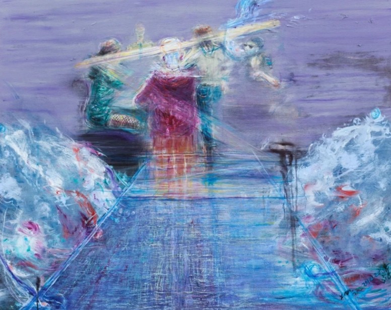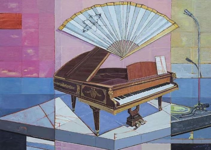 图像与现实的界限越发模糊是当代图像生产和消费的特点之一,余学民以地质纪年命名的系列以及“爱琴海”系列作品中,现实场景或日常什物总是伴随着古代雕像和历史文物的意象一同出现。这种图像处理方式拉近了图像与现实的关联,打破了现实与历史图像的界限。同时通过场景与空间的错位关系,加强了图像世界的荒诞感和疏离感。而画中反复出现的各类文化载体生成的物象也都随着图像背景的错位而变得残缺不全,这种图像的建构方式恰恰与今天绘画中流行的平滑光鲜的风格形成鲜明对照。正如余学民《碎镜》系列作品的表现性风格:破碎的、错位的,重叠的、模糊的、异质的、杂交的、穿越的;以这些定语修饰的图像,成为余学民的跨文化图像志的方法论,也代表了今天图像世界面对的基本问题。