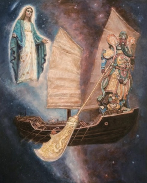 历史上,寻找并实践这种跨文化主题的艺术家构成了艺术史中独特而具有文化价值的一环。从17、18世纪洛可可艺术中布歇等画家的“中国风”(Chinoiserie)绘画,到19世纪梵高所谓的“日本风”(Japonaiserie),艺术家们把东方异域的想象表现在画布、器物甚至建筑和园林中,出现了一些既不中国也不西方的杂交产物,如画中怪异的宝塔、人物怪异的发饰和容貌等。这些意象有些是文化误读的痕迹,有些是挪用经典图式的结果。后来的艺术家把这种跨文化误读和挪用当作创作观念,来表现跨文化主题。从安格尔笔下的土耳其浴室和德拉克罗瓦描绘的阿尔及利亚妇女,绘画对于“东方”的异域想象和重构跃然画面;到后印象派高更画中的塔希提(Tahiti)女性及其信仰象征,一种欧洲对东方及更遥远的大洋深处文明的想象和体验,籍由图像的方式构成了一种跨文化的“时空体”(chronotope,巴赫金,1981)。