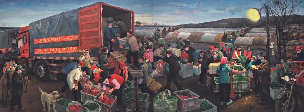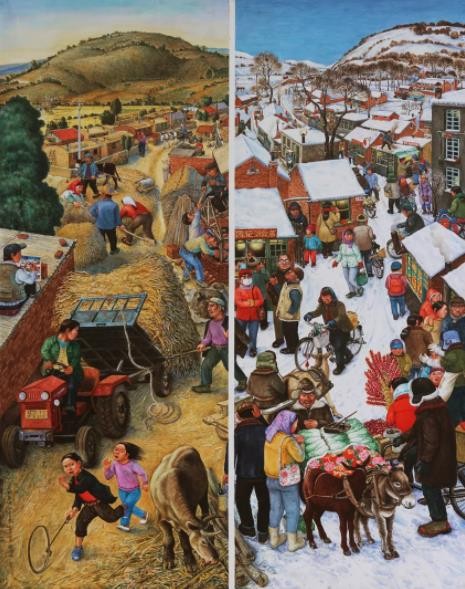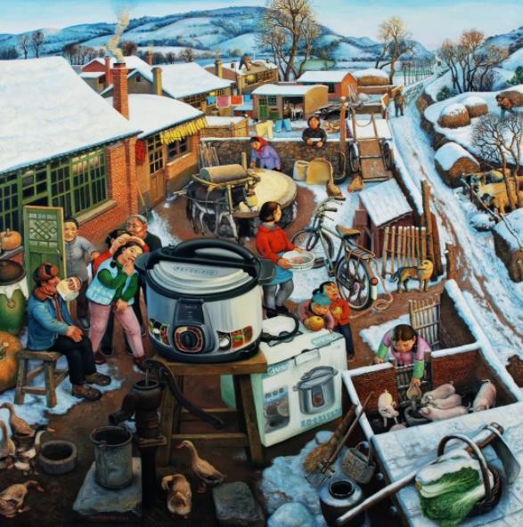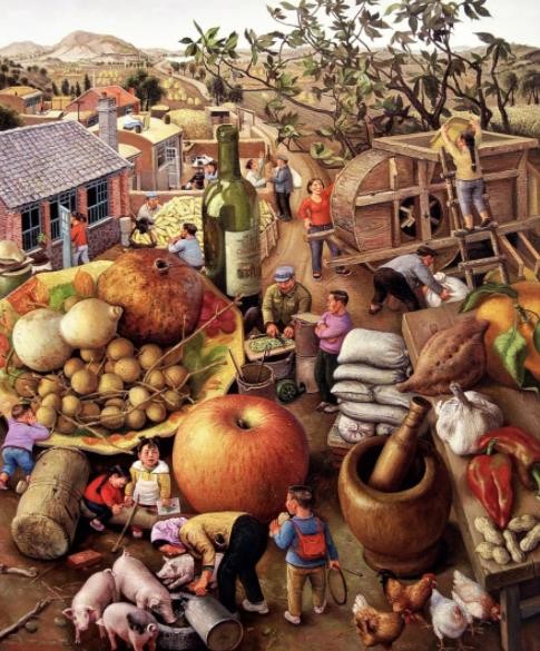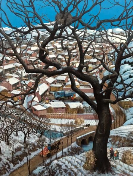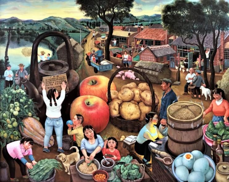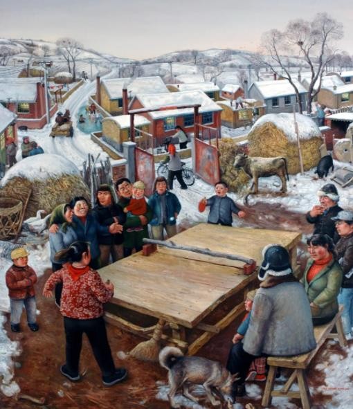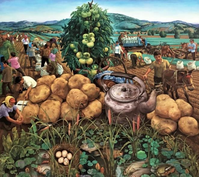 走进陈树中的绘画世界,首先让人感受到的是一种繁复之美。这种独特的视觉张力与审美感受得益于全景式的构图。不同于西方文艺复兴以来的焦点透视,陈树中追求的是一种符合中国人观看经验的、类似于中国传统山水画的“散点”构图方式。在画面中,近景、中景、远景绵延交错,特别是艺术家对叙事性的倚重,使其空间的表达让位于情节的演进。尽管如此,画面同样能带给观众“可行、可居、可游、可观”的体验。当然,宏大的、绵延的、全景式的构图,也来自于陈树中对作品叙事性的高度重视。虽然是全景式的,但艺术家并不追求单一的、线性的叙事,相反,是非线性的、断裂的、多维度的。正是这种非线性的叙事,为画面注入了一种独特的视觉逻辑,使得繁复的视觉之美得以强化。陈树中绘画另一个鲜明的特点是超现实主义与浪漫主义手法的结合。所谓的超现实,就是说艺术家在表达一个对象和主题时,采用了一种夸张、幽默、诙谐的表现手法。反映在画面上,就是用超大的画幅、夸张的比例去描绘一个对象,比如土豆、水壶、火锅,或者一个苹果,同时,在人们熟悉的生活片段中,艺术家去捕捉、挖掘其后的寓意,例如,红布包象征的是“聚宝盆”,硕大的果实代表着丰收,而桂圆则隐含着一对新人爱情的圆满。诚如艺术家所言,“我采用浪漫主义的表现手法,努力表现出作品淳朴的诗意和趣味化的表达,让乡土的一切散发出质朴的诗意,让草木焕发出情感,让大地充满生灵……”实际上,采用超现实和浪漫主义的手法,最为内在的情愫,自于艺术家对北方农村生活和人民的礼赞。第三个特点是,陈树中构筑了一个庞大的、系统的、关于北方农村生活的图像系统。在艺术家的笔下,有丰富的自然景观,如北方辽阔的大地、起伏的山梁、高大的北杨、银色的冰河;有近距离的现实场景,如人民的劳作、赶集、捕鱼、庆丰收等;有充满地域与风俗特色的画面,如北方的过年、乡村的婚礼,还有孩童们各种嬉戏的场景……数十年的创作,数十年的积累,艺术家呈现出一个鲜活、丰富、具有浓郁地域特色,甚至具有人类学意义的北方农村的生活画卷。