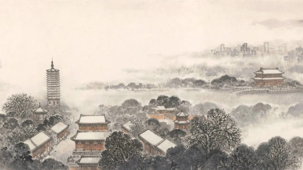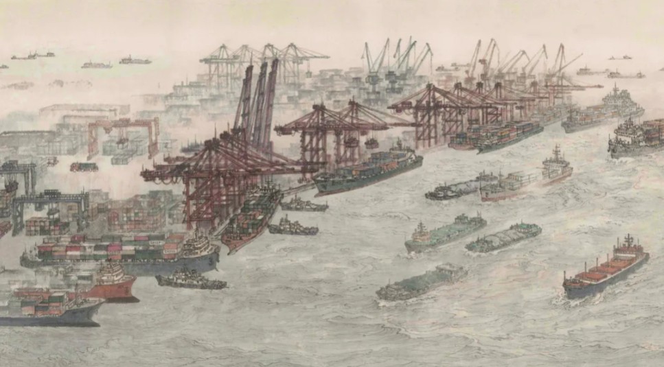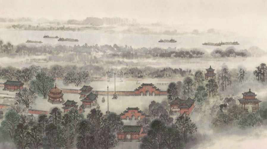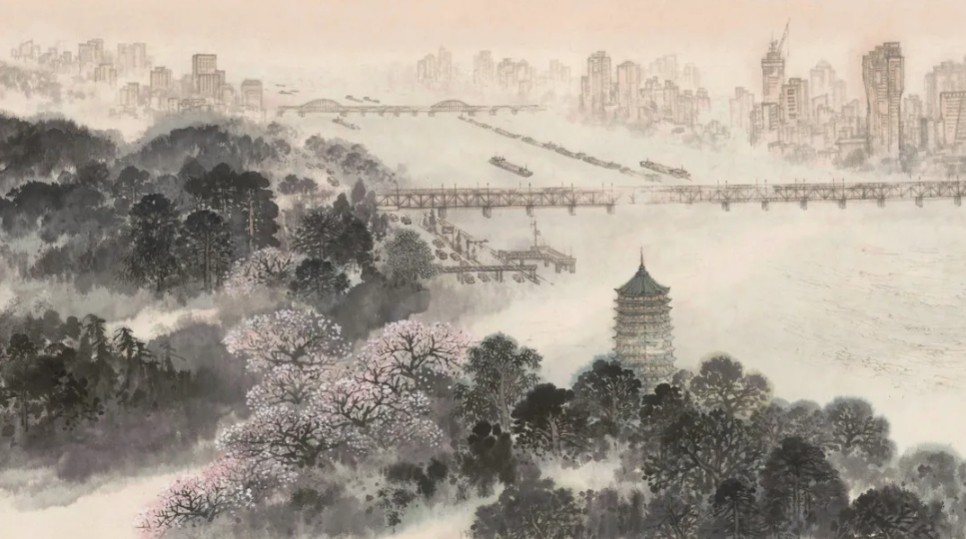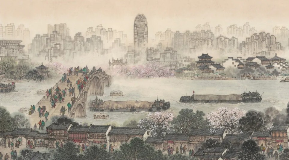 以诗言志,以画传情。画家高鸣采用传统中国画特有的“散点透视”式构图,全景描绘京杭大运河的自然风貌、历史人文景观以及改革开放以来两岸欣欣向荣的景象。由“长城内外,惟余莽莽”?的北国京津,到冀鲁大地的“满载一船秋色,平铺十里湖光”,再到江淮平原的“沉舟侧畔千帆过”“二十四桥明月夜”,终达吴越花雨的“月明船笛参差起,风定池莲自在香”,留下的是“万里江海通,九州天地宽”的大气冲达和绵长隽永的美学回味。