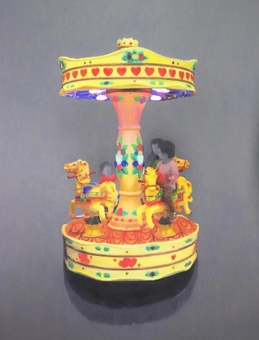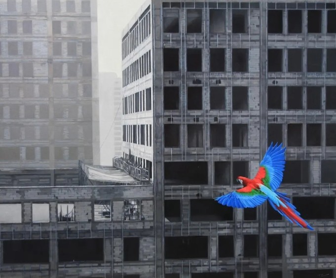 铁心以绘画形式对当代社会做出设想。他的画面不常对主体生命进行直接的描绘,而是通过留存的生产活动和改造痕迹,来形成秩序化的视觉背景。空旷的高楼、废弃的车辆都承载了社会系统规训之后的局面。灰调变成一种中性,而非全然的冷漠与空洞。也正如此,高度饱和的局部色彩——鸟、蝴蝶、凤凰、木马、百合等元素——像似从精神内部燃起的图像,被定格在画面之上,成为视觉的裂口。它们打破冷峻,指向一种非现实的、他者的心理空间,有着存在的思索。