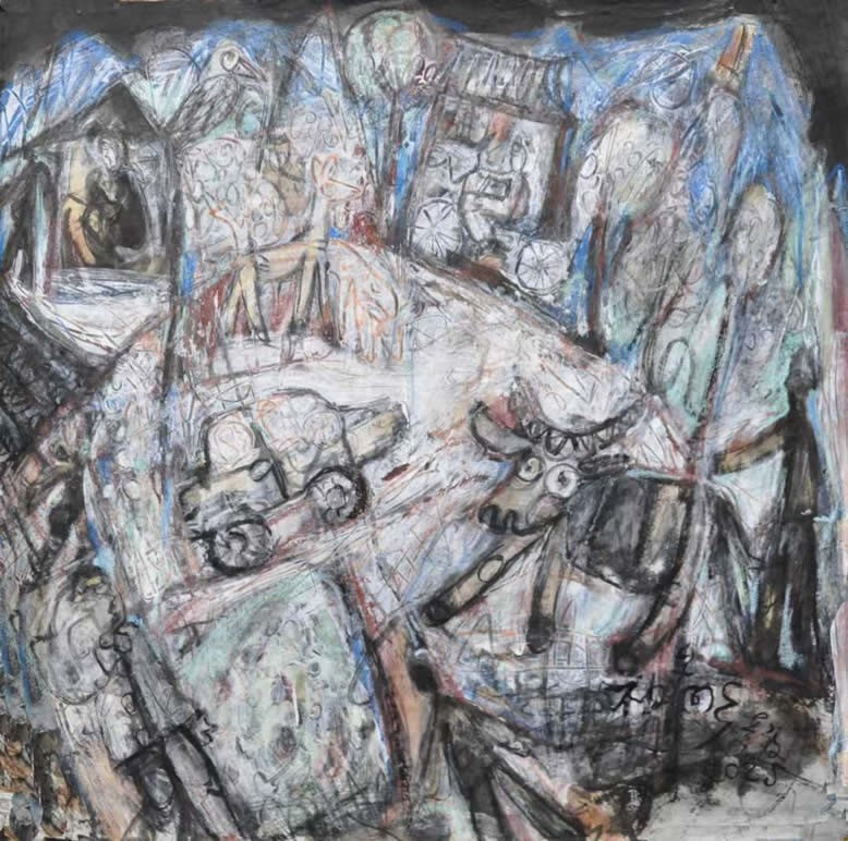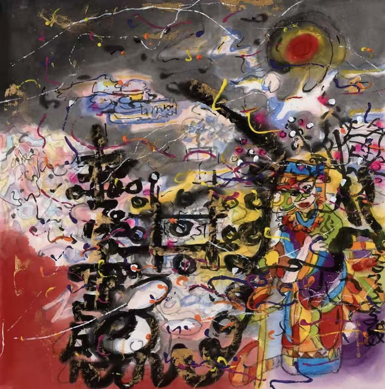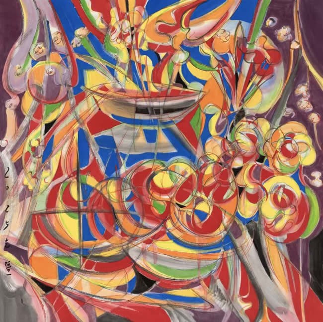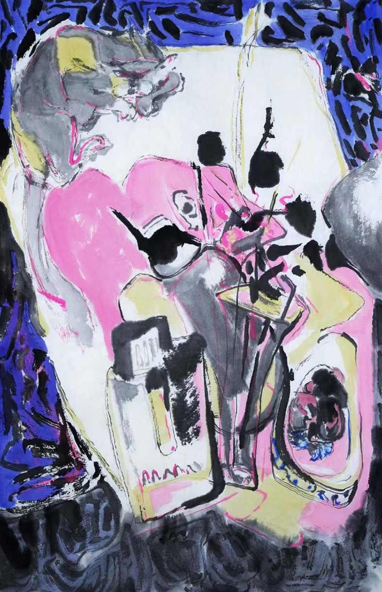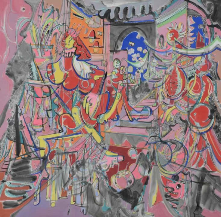 李晓柱的绘画从1980年代开始,接续人物画的漫长谱系,保留笔墨韵致,而加以大胆的现代性的变形,就是以欲望和寡淡的悖论感知拉长女性形体,如同马蒂斯与常玉,并且置于男女的对峙与时代生命经济的反讽之中。进入21世纪的彩墨系列《桃花渡》则把长型女性形体融入到桃花的纷纭之中,把具有现代单色绘画感的暗淡黄色向着性感的红色转换,让妖艳与鬼魅的色彩融入变形的形体,其琉璃闪亮的质感,把魔性、物性、还有自然的生长性,完美融合。来自于水墨与彩墨的感性融合力量,带来了极端的绚烂与极致的妖娆,彻底激活了来自于生命母体的柔和感知,让艺术家可以接着实施更为彻底地转向,即以水性丙烯颜料来画带有鲜明中国古典文脉主题的荷花与莲花,但却已经面目全非,因为记忆女神需要唤醒个体与文化的深度感应。