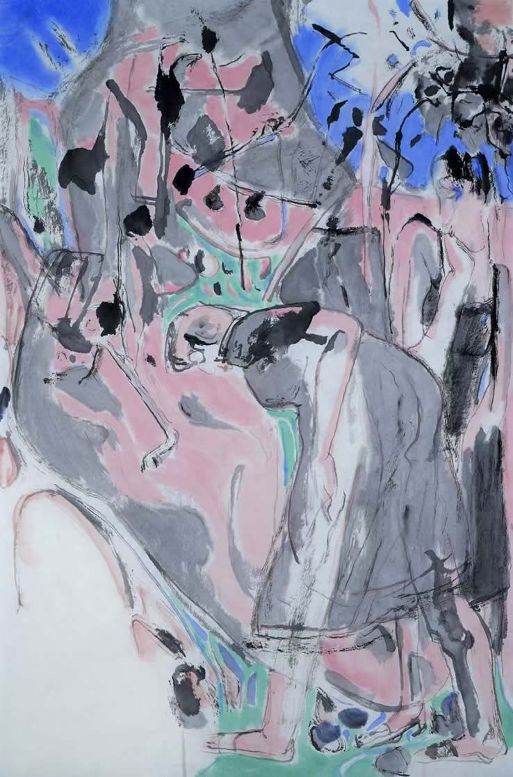 生长于白洋淀的艺术家自幼酷爱荷花,美好记忆的种子早就已经播下了。但不可能按照传统方式去画,在肯定现代性的欲望,甚至是红色喷薄躯体的同时,还要使之融合到荷花的粉色花瓣与荷叶的青绿,还有荷梗的线条之中,甚至整个绘画就是一滴滴荷叶上滑动的水珠,一起都是水,都是水线,都是水珠,都在丝丝牵缠之中,在欲断又欲连之中,交织起来,满福充满,形成波波无尽的微妙振荡。而之前的魔女形象则变得柔婉,宛若女菩萨或女神,经过水珠的洗涤而变得赤裸纯洁,这是绘画的洗涤,这是欲望的消融,这是《爱莲说》的真意:“予独爱莲之出淤泥而不染,濯清涟而不妖。”人性的蜕变已经发生。