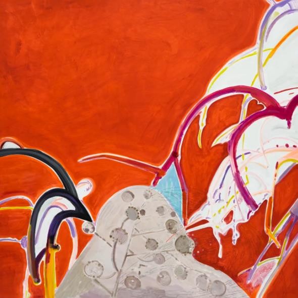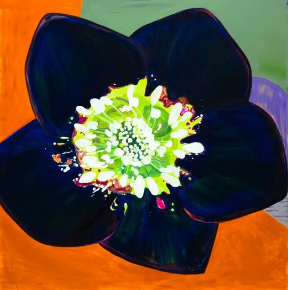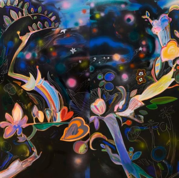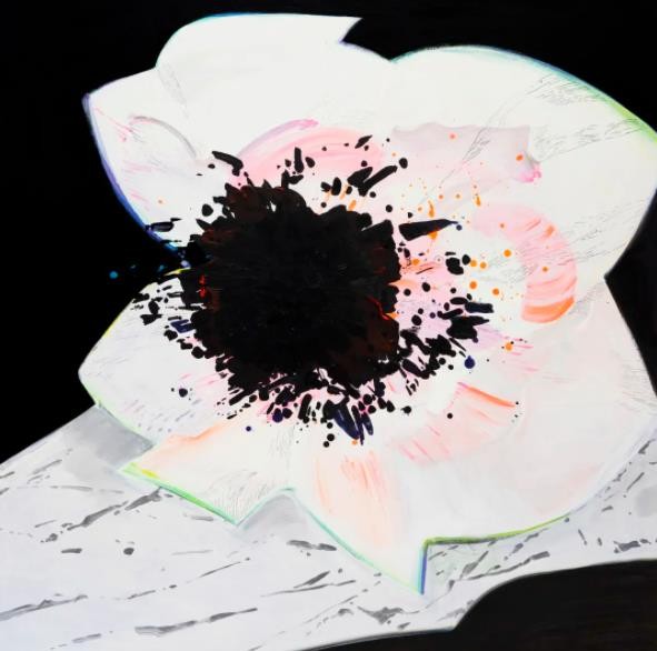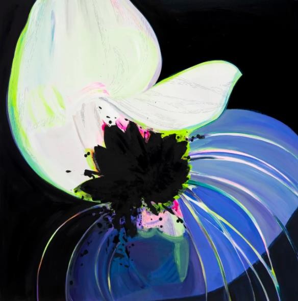 在本次展览中,陈欣的作品主要包括两部分。一组是花卉,取题为《果实》系列。其中一部分是对于单朵花卉的描摹:一朵盛开的鲜花几乎撑满画布,线条流畅,结构饱满,色彩对比强烈甚至显得冲突。比如在《果实01》这幅作品中,花瓣是白色的平涂,局部敷以淡淡的粉红;因为陈欣在创作中常用荧光材料,这使得花瓣显得尤为白亮。但在这片白亮的花瓣的中间部分,花蕊却是大团的黑色,边缘还有向周围散射的黑色颜料,有如泼墨。这种黑白间的冲突让人想到马奈的《奥林匹亚》中黑白两色的对比。马奈画中的黑人和黑猫像一种隐藏在背景中的神秘,衬托和强化着前景中白人身体的大胆袒露。而陈欣的这团黑色的花蕊则像是从画面里向外迸发出的具有挑战性甚至亵渎性的力量,直接破坏了花瓣所营造的关于花卉的那种素雅圣洁的想象。