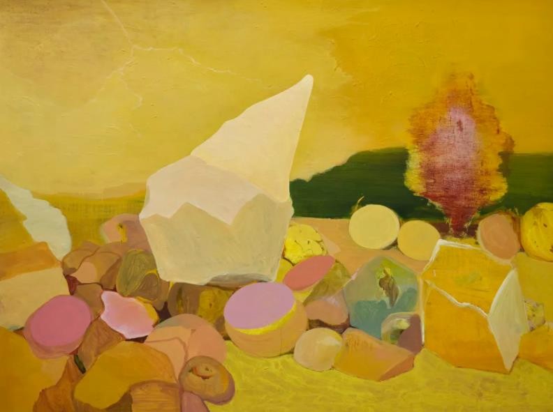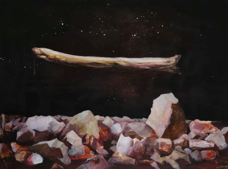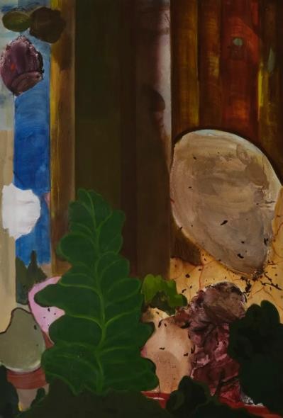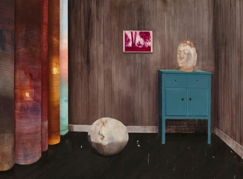 他作品中另一个经常出现的元素是石头,和树林一样,似乎也是没有来由的,以各种姿态无声而执拗地存在于多种场景之中,有时还显得非常巨大。比如同样是一幅题名为《丛林》的作品,而且是这一系列中难得一幅显得较为轻松透气的丛林——画面前景里有一整片巨大的墨绿色的叶子,体态轻盈,丛林的深处也透着一片较亮的蓝色,甚至画面右侧还有阳光照进来的树影;但在这幅画面里,依然有几块石头或者浮在或者挂在丛林里。这些反复出现的石头,让人感觉像是现实里某种无法回避的存在,它们总是不时地甚至不合时宜地出现在我们生活中,安静、别扭,但是本身又是饱满的,轮廓分明的,有着耐人琢磨的细节。