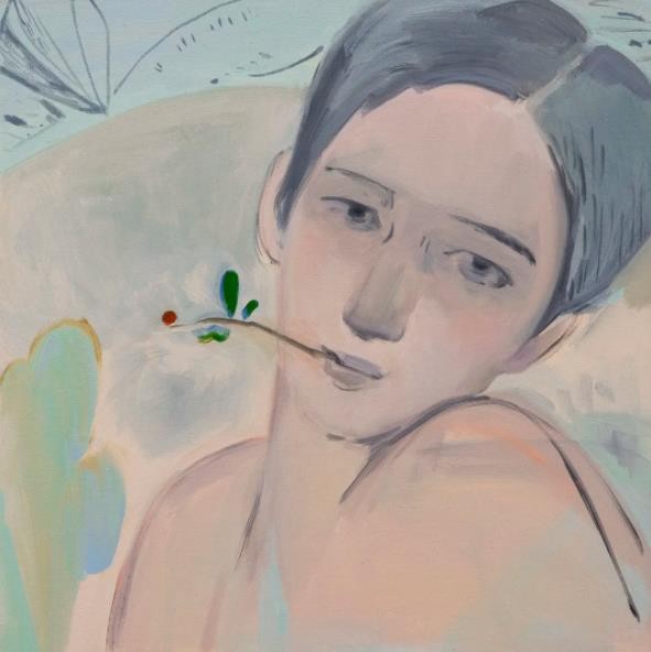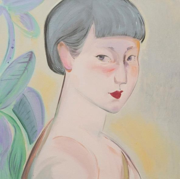 而她的四张肖像作品则又有另一种难以名状的意味。这些对象的面部和身体的轮廓线纤细优美,用笔简洁有力。薄而均匀的粉色颜料涂抹皮肤,大多与背景色接近,而且少有细节和阴影。他们的面庞和体态显得圆润而柔和,眼神直视观众,好像是在诉说着什么,但是因为画面元素的简练,因此他们的讲述又变得无从捉摸;这因此而成了一组身份不辨的、单薄而神秘的现代女性肖像。陈欣说,这些肖像其实并没有具体的人物所指,她往往是将几位不同的朋友的脸部特征组合在一起而构成一张新的无名的面孔,有的甚至是不同性别的人物的结合。她说她的确想要去模糊性别的边界,抹除身份的定义,从而能塑造出一系列独立的、只是作为人本身而存在的形象。