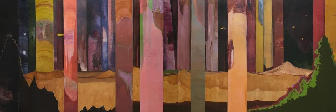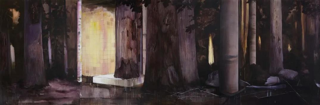他这次的参展作品《丛林》,长度超过了五米,描绘了一片寂静而荒凉的森林景象。但是这片丛林里没有树叶也没有树枝,只能看到层层交叠的坚挺的树干,树干的间隙里可以隐约窥见幽暗的丛林深处。这些树干的轮廓是在胶带的辅助下绘制的,显得特别坚硬。它们大多由赭色、灰绿或蓝紫色平涂而成。树干之间隔着深浅不一的土黄色的地形起伏,同样在轮廓勾线中加平涂,因此这片丛林有一种图案感,带有明显的虚构的气质,但又具有特别的表现力。另一幅《丛林》作品的画面色调更暗,树干以深灰到黑色的色调为主,但里面却镶嵌着一片由马赛克瓷砖构成的透着光亮的断墙。而边上的那棵树是“站”在白色的底座之上的,以至于很难分辨那究竟是一颗树,还是一根柱子。在画面的其它部分,丛林的深处还有几蔟火苗,让整个场景显出几分诡异的气息。