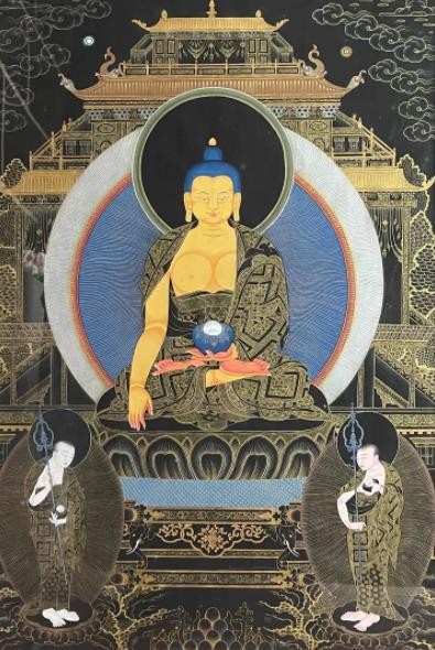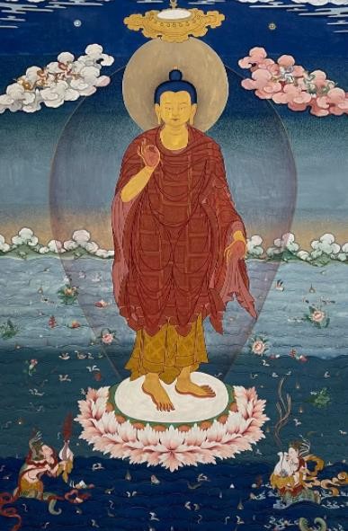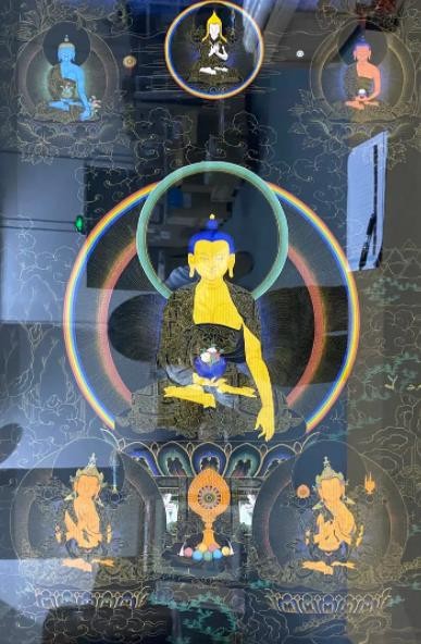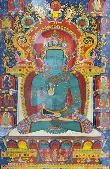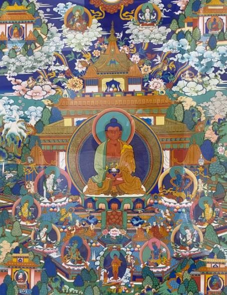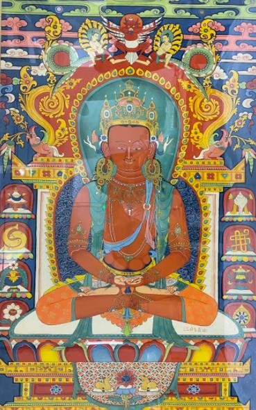 唐卡艺术在发展中形成了多个绘画流派,其中最有影响力的是发源于西藏日喀则的勉唐画派。勉唐派造象度量严格且庄严,色彩鲜艳明亮且典雅,底色厚涂,人物造型圆润,服饰汉地样式化装饰繁杂,云树山石来装饰点缀。勉唐派古往今来名家辈出,本次展览中的大多数作品都是现今活跃在唐卡艺术界的勉唐派名家精品。