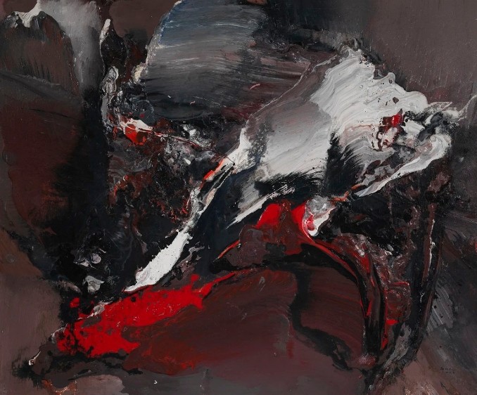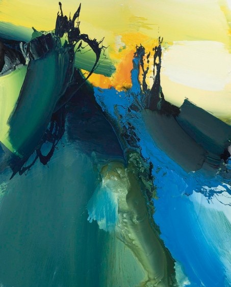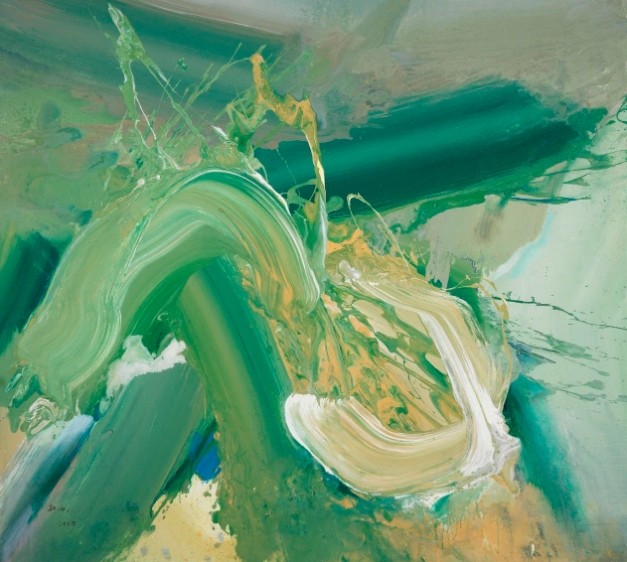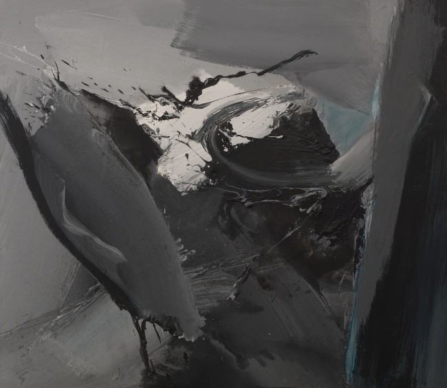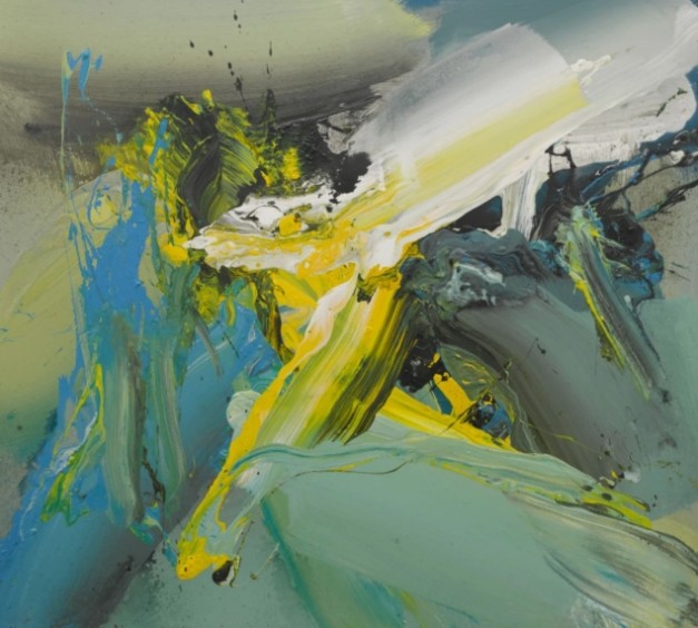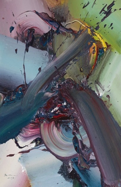 多年来,韩中人在自己的艺术探索中,一直都在进行刚柔与东西的融合:一方面将书法的线转换成粗粝的笔触,通过挥、洒、压、扫、泼等方式,来表现与生俱来的阳刚气质;另一方面通过水性材料的快速成型法,借不同色块间的推挤、冲撞和侵蚀,将表现的力度和挥洒的速度甩到画布之上,从而产生出一种强劲的视觉张力。正如他的老师闻立鹏先生所言:“他的画是一盅烈酒、一杯苦茶、一盘火烫的红辣椒。总是有一股火山喷射、泥石流爆发的力度。”应该说,这正是韩中人艺术作品的显著特征。也就是说,他将阳刚气质通过水性材料表现出来,即将柔性与刚性进行语言转换,不仅赋予了抽象表现主义绘画以中国写意精神的神韵,同时也为中国当代绘画注入了精神的强度与表现的力度。