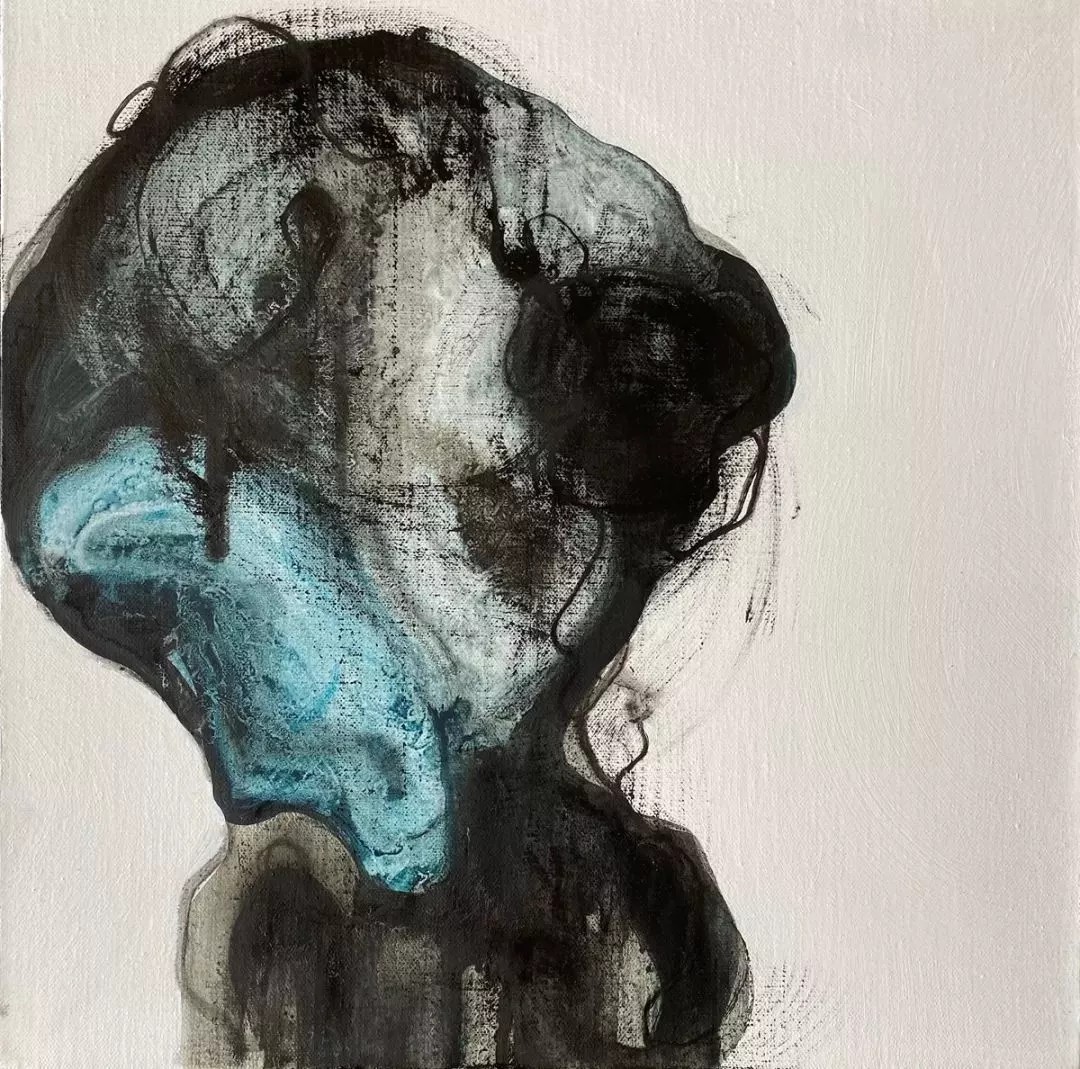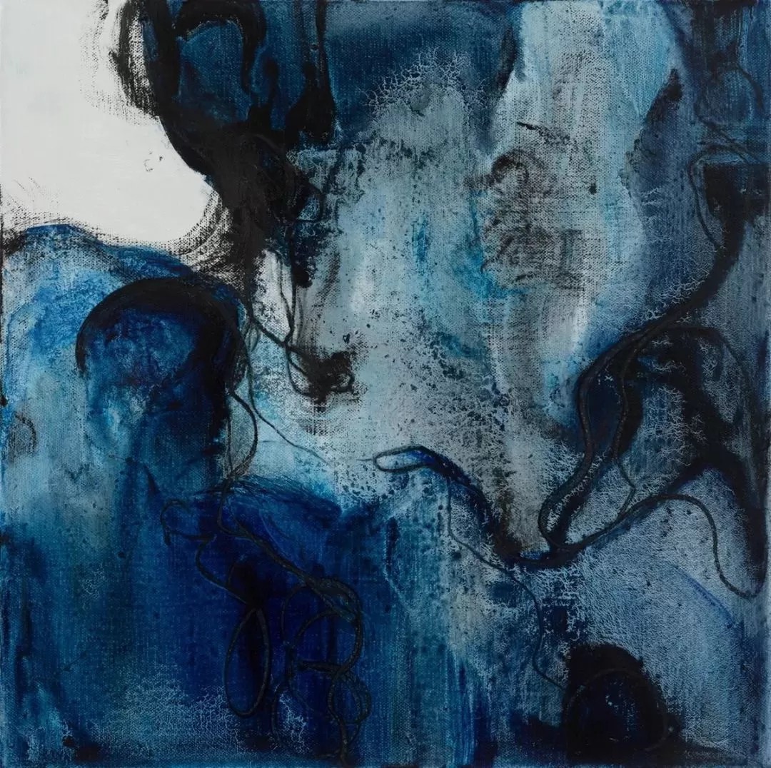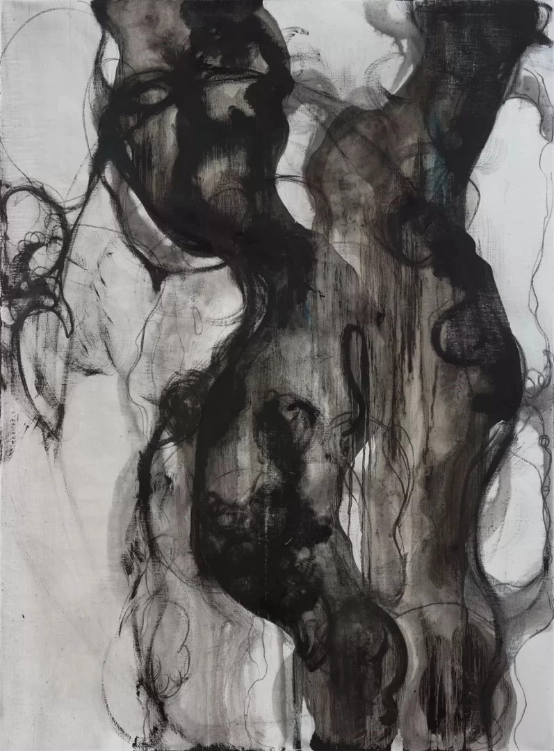 如果说通常意义上的感知是借助知识和概念去形成对世界的观看,那么廖培试图通过绘画提供的感知则是通过内在的心灵机制去探索人的存在感,她提供了一种来自心灵的绘画方式。在《残缺的记忆》中,横向展开的画面用灰色的底色为背景将那些分散在不同时间序列中“过去”的自己一字排开,这仿佛是对某种极致宁静状态中的幻觉体验。在这里,过去不同时间中的自己相互观望,仿佛一种伤害与刺痛的体验,凝视着现在的自己。在《蔓延》中,一个自己的躯体分泌出了另一个时间中的自己,环绕在其中的线条拉扯着这个过程,仿佛不同维度的时空弯曲。在《生长》中,那些人影般的肉状物如同蜷缩的身躯在各自的另一层重影关系中由缠绕的线条联系着。在《时间的两极里-我的肖像》中,时间的痕迹感更加明显,画中整体的黑色块面亦如时间的长河,而那些分泌出乱序线条的自我从躯体中散发出流淌和飘走的时间,再次汇流入时间的长河与无限之中,那些裂痕与缠绕显露了秩序的关联性。在《隐藏者》中,强烈而浓重的暗黑映像出了某种灵魂性的在场,线条的交织诠释了不同的时间片段,“影感”的绘画性使得这种感知的传达亦如午夜的惊魂。