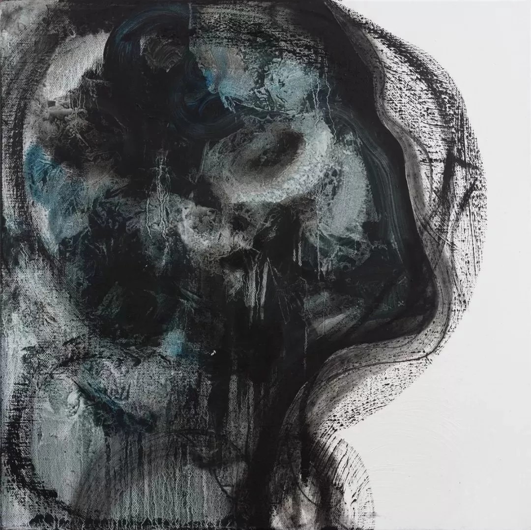 廖培近期的作品营造了一种黑色夜幕般的幻觉,黑洞般旋转的洞口与佛珠明亮的隐喻,一个个难以识别的怪异形象的叠合与存在,暗黑语境的气氛化与某种若隐若现物体的显现,物体异样存在的肉体感与零散线体的缠绕,在撕裂与显影之间,是快速扫过画面的笔刷痕迹和浓重层次空间的墨韵组合。在这些作品中,固有形态呈现出了异样的状态,可识别与难以识别的物象也被稀释为液态或气态的流动,飘散在不同时间交错的心灵感应中,廖培的绘画营造了黑色语境中某种“状态的影像”。在这个世界中,植物的藤蔓、身体的影像和器官的机能在“跨物质”的梦境转换中被重新建立了联系,一系列违背常理秩序的形体、肖像、血液、器官被安排在各类生命形态的怪异氛围,那些存在者的身躯、无声的诉说、哭泣的气息、静默的站立、难以分清的界限、……,一切被赋予了另类化的情感属性。仿佛在一片魔幻的森林里,在物体形体跨度极大的冒险中,画家重塑了某种被遗忘和压抑的生命感知。