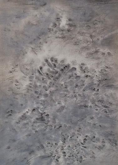 五年前再回到北京的时候,工作室需要搬迁,他和很多在京城的艺术家们一 样,搬到了远离城区的六环路之外的一个村庄里,简陋的、全新的排屋,像一 个小型的营地,新铺好的院子没有石榴树,夏天极其闷热,北方的太阳晒到水 泥地面上返回一拳燥热,工作室没有暖气,冬天冷得无法握住画笔,我驱车去看他,一路上迎着灰暗天空下的的夕阳,想起博尔赫斯那首著名的诗,“我给 你贫穷的街道,绝望的落日......”从车窗看着落日像软掉的气球,飘在灰暗的 城市上空。