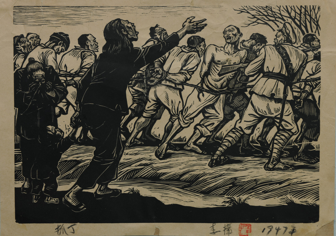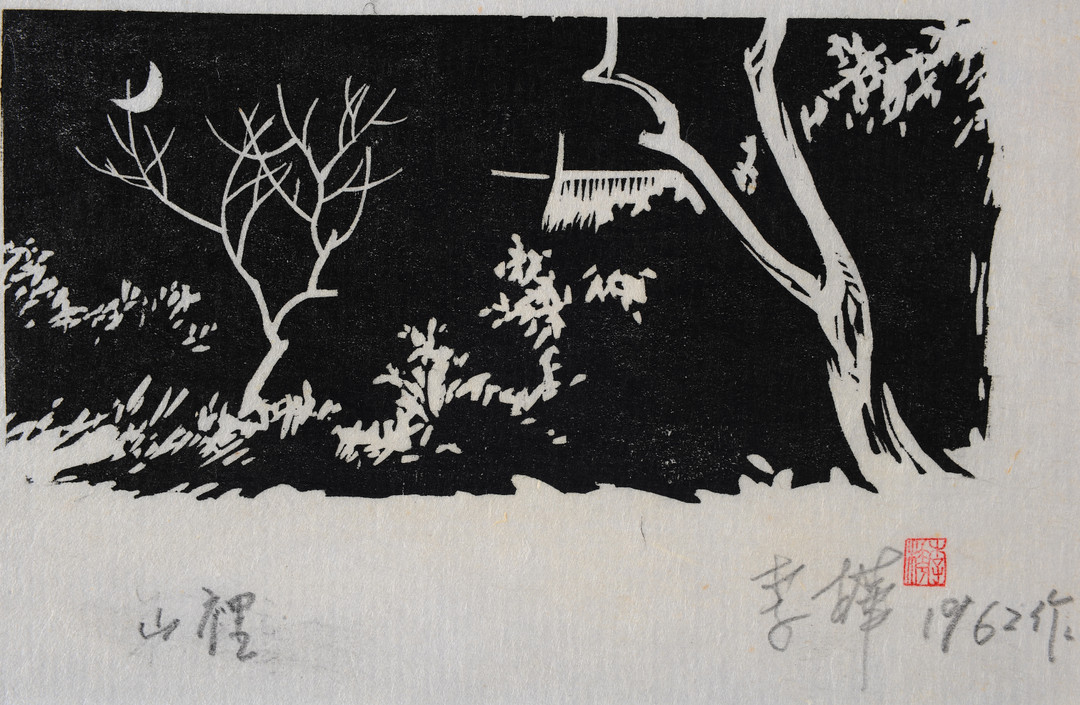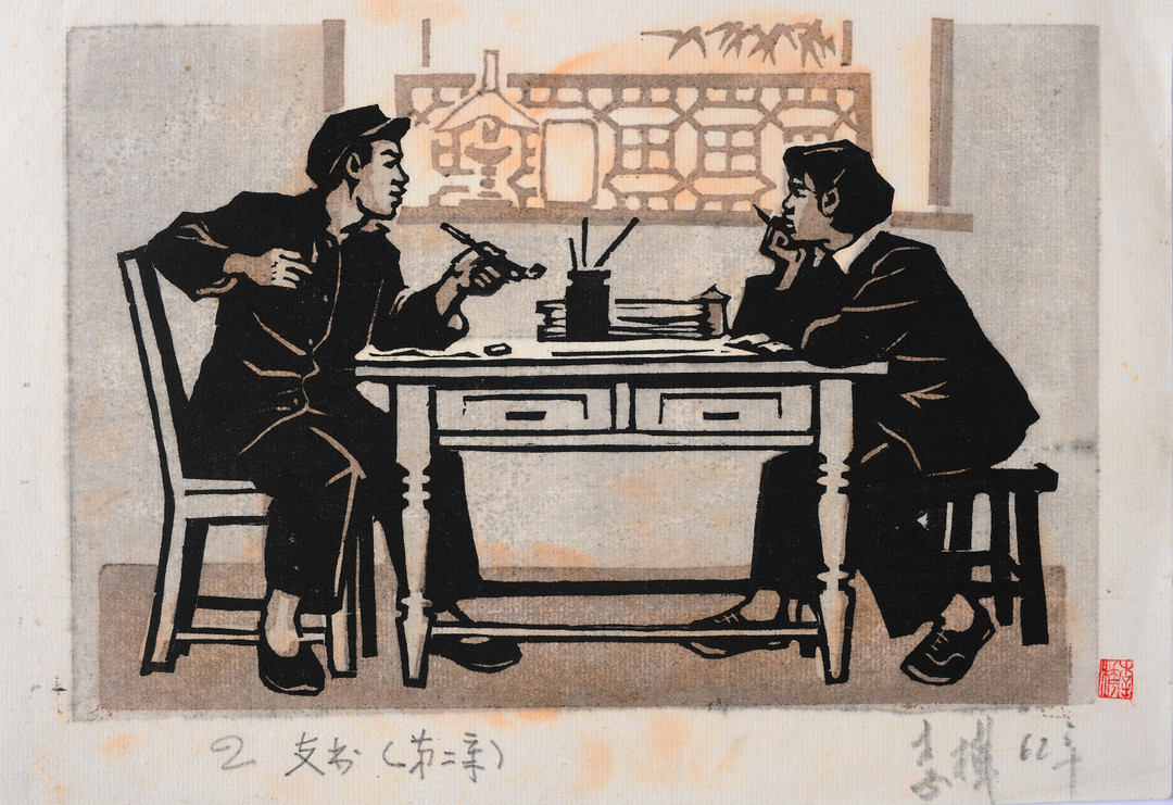新中国成立以后,新兴版画有了良好的发展环境。版画艺术成为社会主义艺术事业的一个重要组成部分。由于版画家的思想活跃,提高了艺术创新的热情,工具材料的革新,在内容和形式风格上的探索,取得了新的成果。题材也相应扩大,以前较少接触的风景、花卉等题材,都有优秀作品出现。李桦为周立波先生所着长篇小说《山乡巨变》创作的系列版画较为全面地展示了新时期、新中国、新面貌,淋漓尽致地展现了一个时代的巨变。为了创作这一系列作品,李桦特意到湖南益阳县桃花仑乡体验生活。他找到周立波用作小说主人公的模特,和他共同生活了一个多月,画了许多生活速写及生活素材,包括人物形象、自然风景,以及生产、生活用具等。这套版画插图不仅忠实于文学原着,而且作为完整的插图艺术,有其独特的存在价值。最后他完成的这套水印套色插图,造型凝练、色调淡雅、刀法遒劲,极富张力与节奏,具有很高的艺术性,是李桦出色的一部代表作品。