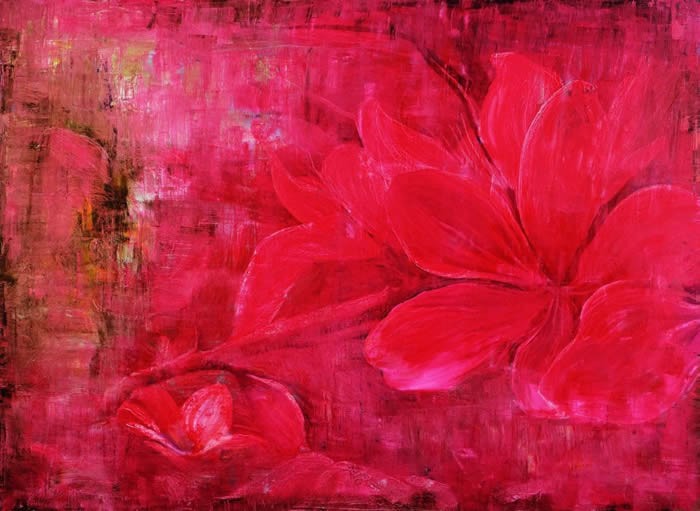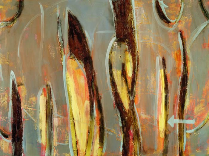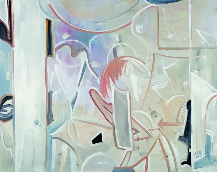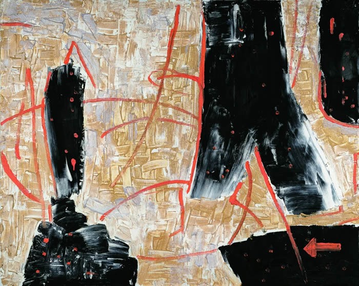 郝强的展览作品是他近年来的新作。这些作品色调古雅,画面简洁而不喧嚣,偶尔粗粝的绛红色线条与黑色的色块激跃着远古遗迹与回想。画家以静观的方式吸收传统文化中某些符号融入图像中,他似乎希图在中国传统文化当中去寻找某种言说的方式和创作的母题,把中国传统文化更好地融入到中国当代艺术中。他尝试把目光转向东方传统哲学甚至是禅意文化上,引禅入画,开启自己的绘画新方式——这是一种文化自觉的方式,是一种寻找心灵依托与精神归宿的方式。