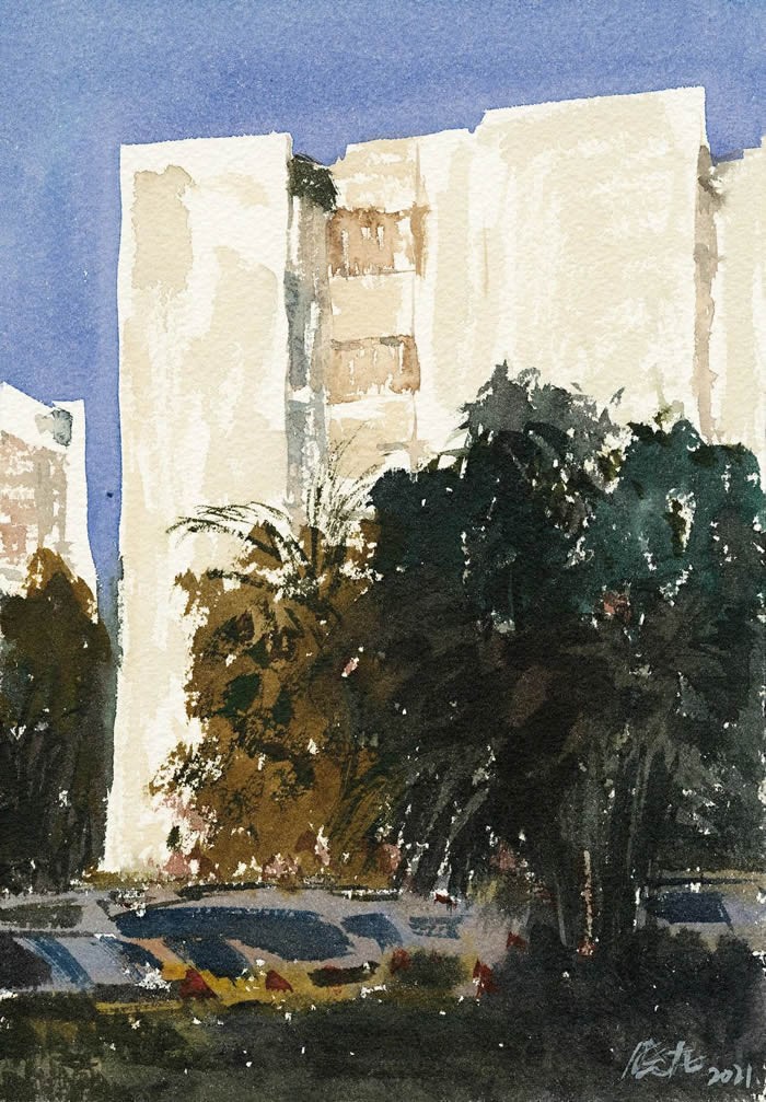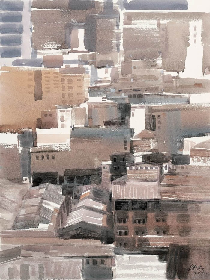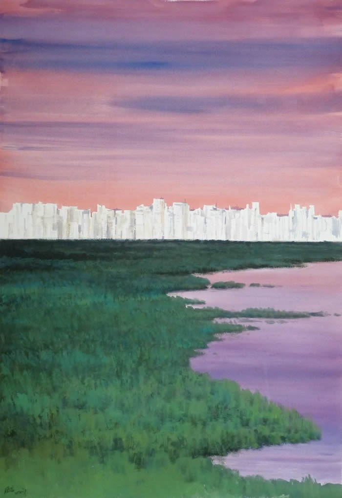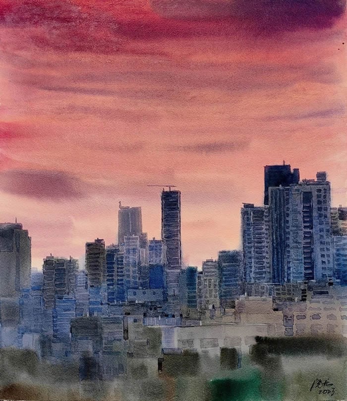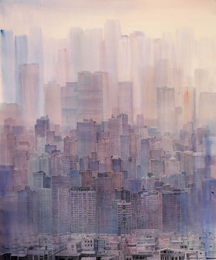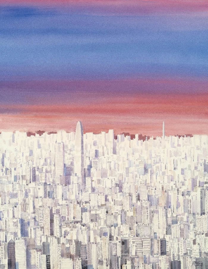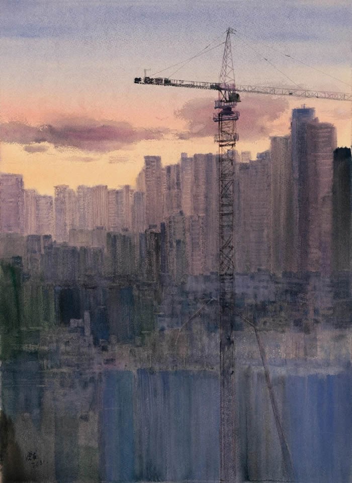 而晓龙的绘画则表现的是对深圳这座城市远望,表达了城市的喧嚣与繁华,但作品却以静观的方式表达了四十年深圳这座城市的巨大变化与变迁,表达了自己对这座城市的喜欢与热爱。我们所处的当下年代,城市版图的扩大和高楼的快速建立让我们的城市越来越繁华,这使得城市在不断自我更新、自我完善、自我选择中产生了许多自我的城市性格。不经意间,我们停了下来,静观城市,远望大地,一切还是那么的怡然自得气象万千——这才是一份真实的自然呈现,是一份源自内心深处的深切感悟。