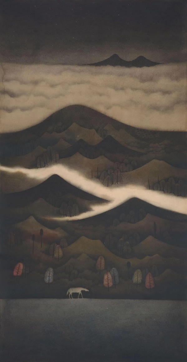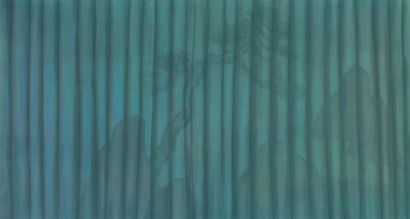 黄红涛艺术的根脉,在那广袤、悠远、辽阔的松嫩平原。在离漠河1000公里的地方,除了冬天零下三四十度的冰天雪地之外,也有着春天翠绿的大树、夏天繁盛的杂草,以及秋天的五彩斑斓。《无名山》是黄红涛艺术创作的起点,也是他师法传统、走出传统,不自觉地在传统的精神内核之中开始自我孕育、自我生长的发端。他不愿人云亦云,只在传统山水的笔墨程式中打转,而是希望画出属于这片黑土地的真实感觉。他化繁为简,将山的形状概括为三角形的轮廓;繁茂葱郁的大树,只画出最简单的树形。他积墨为形,所有的形状都是在色与墨的涂抹过程中自然留出,单纯、静谧、悠远、神圣,画面分明有一种陌生感,却又映物含真,充分保留了中国绘画的韵味。《无名山》是黄红涛将传统绘画与当代性融合在一起的最初尝试。“80后”艺术家的成长环境,使得他可以自如地思考、吸收传统或西方或其他所有地域的艺术资源、观念与问题,他将这一切与中国人骨子里追求和谐美好的传统艺术精神相融合,“当代性”自然而然地嵌入到他的中国绘画当中,成为“80后”中国艺术家的气质构成。“当代性”是自然生长出来的,不是借鉴西方的艺术观念,而是既融合了中国画的传统精神与传统技法,又有个人的情感生发与当下的人文观照,是艺术家此时此刻所思所想的体验与感悟,进而化为个人化的形式语言,呈现为笔墨纸砚所营造的视觉效果。当《无名山》逐渐成熟并成为黄红涛的个人标志,也为他带来市场的成功时,黄红涛极力想要维持内心的平静与从容。也许面前所见还是往日的山川,但看山的不再是从前的少年。他的无名山中,开始有了轿车,有了城市。2015年前后,黄红涛尝试向观念更进一步。LV的标志与“无名山”的风景拼接,达利弯曲的钟表上是“无名山”的LOGO,还有各类名牌包、手表等奢侈品全部打上了“无名山”的印迹;从中国元素中,则选择了太湖石用细细的金线捆扎。在技术技法上,黄红涛不断打磨,他选用厚厚的特制宣纸,一遍遍抹刷,有时多达数十层,画面形成了色彩的厚度与丰富层次,制作方法秘不宣人。他在2016年创作的作品《枪钓》在观念与技术上结合得非常自然,深蓝色的色调层层递进,“环保”“反战”与“自然”的主题将东西方观念融合为一。随后的“看山”系列,黄红涛让“他”出现在画面之中,望向对岸依然静谧、单纯的“无名山”,带着一丝审视、怀疑、诘问。在这个阶段中,他还以《看风景》为题,用水墨创作了一系列都市风景、人物、动物。在自然山川之中,或在别墅绿荫之中,泡温泉的人们远望着高楼林立的欲望都市。他的艺术创作继续向前延伸,并不刻意寻找符号,而是从画面中的一个形象到达下一个形象。他重回传统,却转换了传统的表达方式,质感鲜明的窗帘上是宋代花鸟画,是《千里江山图》。他用这种方式重新理解传统:中国画的传统绝不仅仅在于水墨皴擦的技法,而在于中国的艺术精神,在于中国艺术中所包含的自然观、宇宙观、道德观,以及随时代而变的艺术语言、艺术形式的创造。在东北这片地域、在互联网这个时代所构成的时空中,黄红涛的艺术创作,像藤蔓一样,自生长、自演进,有着清晰的逻辑内涵。如何从观念再回到最初的情感力量,回到艺术创造美好、打动人心的初衷,才是艺术最终抵制AI对图像复制、整合、变形的关键,这是黄红涛下一个十年需要努力实践的问题,也是他和“80后”艺术家们能否真正用中国画的当代表达跻身于世界级艺术家行列的关键。