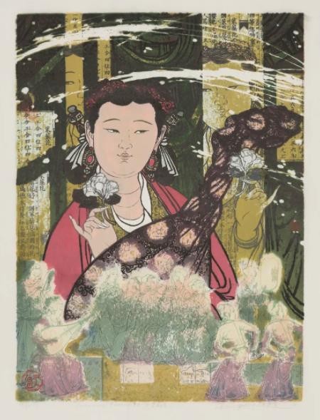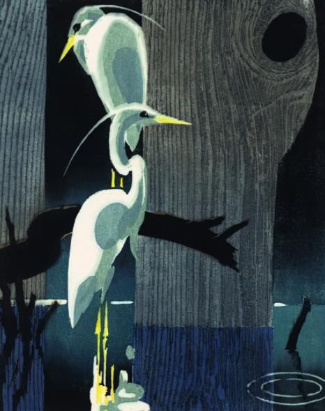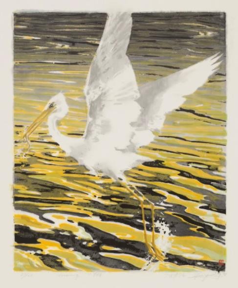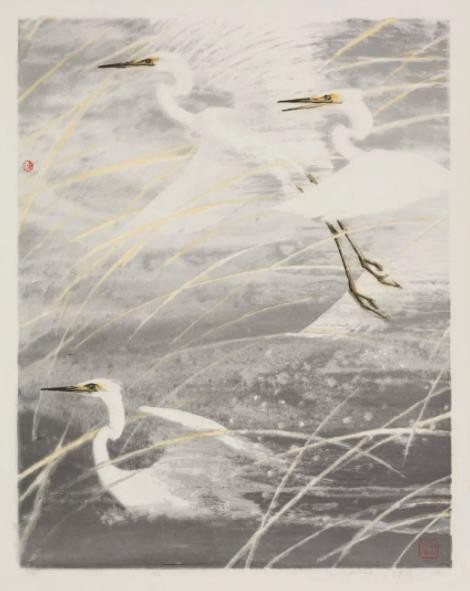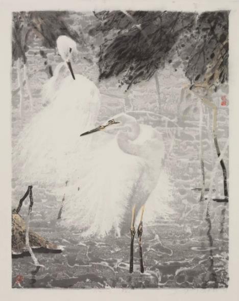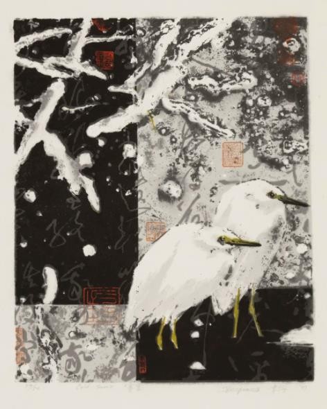 陈聿强的水印丝网版画,以“鹭鸶”和“汉文化”两个系列最富代表性。前者以语义迷漓的象征体,透溢着老庄哲学及传统山水画中特有的精神气息;后者以语境明晰的字画重组,转述着画家对历史与文化的思考。两者相映互补,构成一种整体上个性化的视觉方式,体现着作者独到的价值判断。