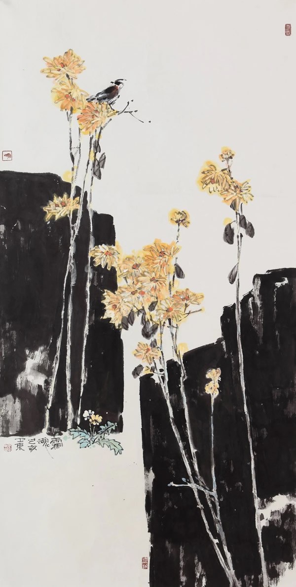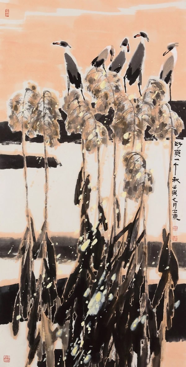 幸运的是,在这个变化多端,各种文化现象此起彼伏的时代,我们总有紧抓时代脉搏,敢于一手抓住传统一手扣住时代的人。卫东兄显然属于清醒的人。他的创作思路一直盘旋在民族文化的根茎,并在这个大的圆周下借鉴和吸收现当代构成理念,来服务于自己主体观念的诉求,这些都可以从他早期的创作题材梳理出来,比如对于梅兰竹菊文人绘画的临习和借鉴,比如对于荷花葡萄题材的生活观察和形式探索等。在司空见惯的文人画题材中,《窗外》一画说明,卫东兄能够自觉地跳出传统文人画的藩篱,在另一种世界中诠释文人的精神,因为他特别钟爱对于野芦苇的描绘。在画中,他截取几尾芦花置放在室内,与滩涂中的大片芦苇以叠加的二维空间组成画面,可谓迁想妙得。他认为,这种生长在荒野滩头和盐碱沟边的野生植物,有着院内和室内花草无法比拟的品质和性格,在严寒中蓄势,在季风中摇曳,坦坦荡荡,从不猥琐,既可远观,也可近赏。所以自己才不厌其烦地将芦苇作为绘画题材的主要选择。