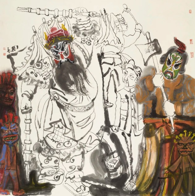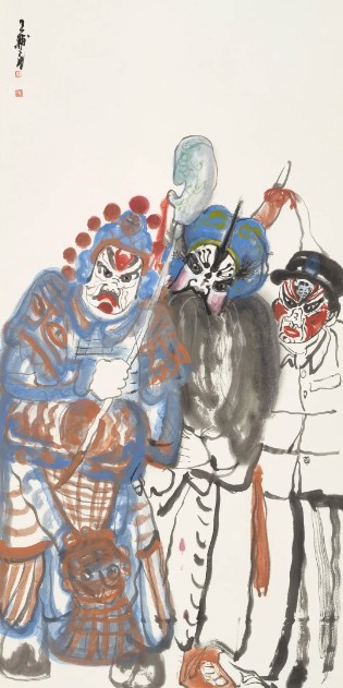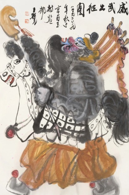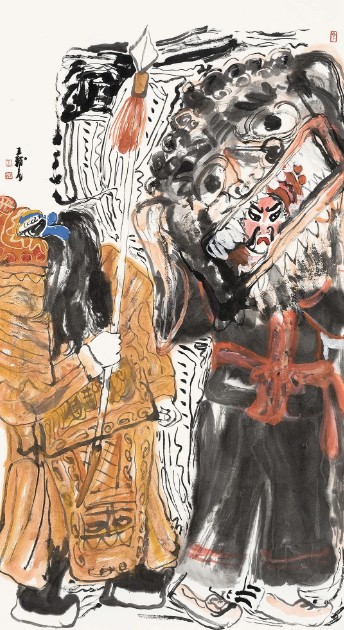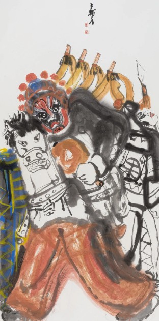 中国社火题材的大写意中的“写意”这个概念的包容性很大,也可以有痛苦的宣泄,如徐渭、八大山人的某些作品,但即便如此,那些作品也是美的,是中国式的。王辅民画的社火是传统写意画的形式,是笔墨和传统色彩在说话。社火和西方的狂欢节比较相似,是外在、热闹、欢乐的基调,不是内在的、孤愤的、批判的基调。它可以荒诞幽默、可以升华发展,是一种中国式的狂欢。社火本身既有内容,也有形式。画社火,要重内容和形式。作为绘画的社火,可以分为两类,一类是画社火本身,如同关良画京剧人物,画出独特的风格和意趣。另一类是把传统社火与现实题材结合起来,即辅民说的“切入现实”,传统社火与现实人物融为一体,成为具有共生内容与形式的现代观念性绘画。这两类绘画,都具有社火的幽默夸张、动态诸元素。前者则应像关良一样,越画越简练、传神。像关良那样熟悉京剧,熟悉文人画,熟悉传统笔墨等等,达到很经典、很中国,能与传统绘画的精髓接得上。后者则以二者的结合,以表达某种现代性的观念为目标。前者属于有生命力的古典绘画,后者则趋向杂交性的现代绘画。