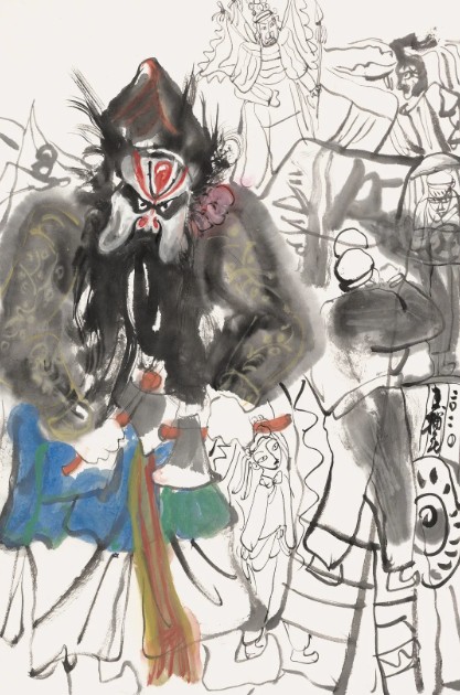 他对于乡土文化的描写无疑具有表现性色彩,而这种表现性都自觉地汲取着这些原生美术的艺术养分。剪纸与皮影因在单薄的平面上塑造形象,便不得不最大限度地简化形象的侧影。镂空作为这种形象塑造的唯一语言,不仅具有造型功能,而且兼备改变造型的视觉形式感,使得意象造型在剪纸与皮影的艺术创造中获得了极大的发挥。他从民间文化中所接触的中国本土文化精神与现代视觉元素,无疑为中国画的现代性探索提供了一个新案例。