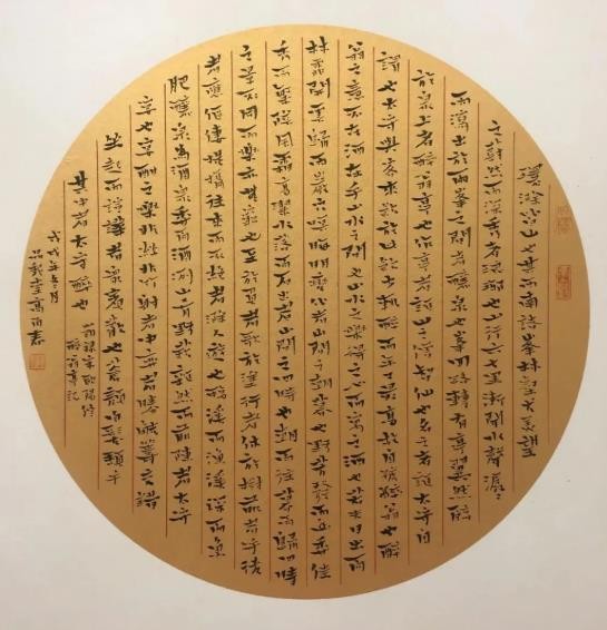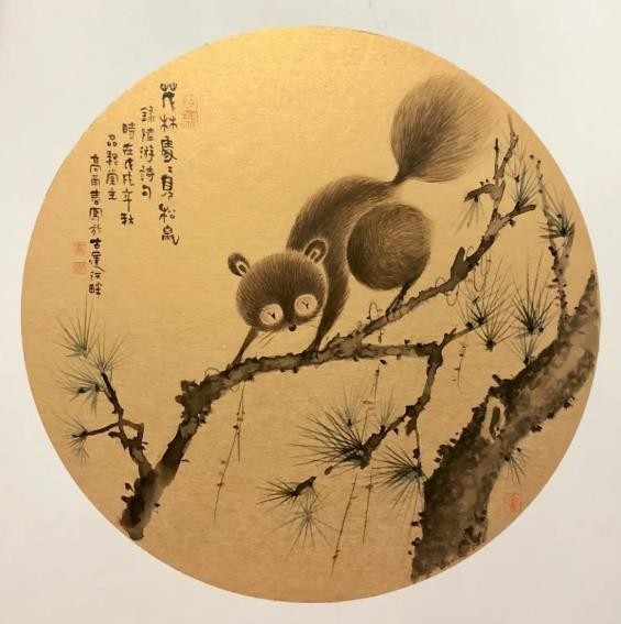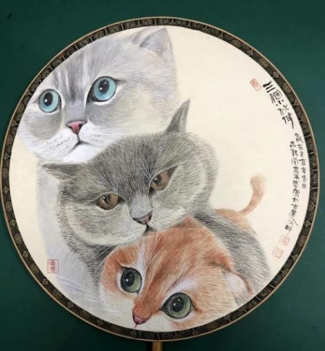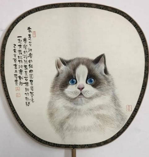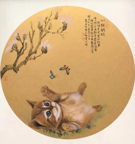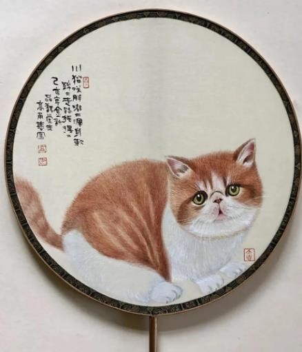 此次展览共展出圆形作品80件,选题分八个篇章:猫咪映扇、金碧山水、萌物生灵、花鸟怡情、诗词歌赋、风月无边、鱼虫雅观、罗汉仕女,均为2017年以来创作的新作,山水用古法为之,入画中之担夫、行者亦是我,游历于山水之间;书法以古帖为师,几种书体均做尝试,徜徉于笔墨之境;小狗小猫小鸟,则多以工笔为之,毛发毕现,更是练笔练心,磨炼自己的意志。