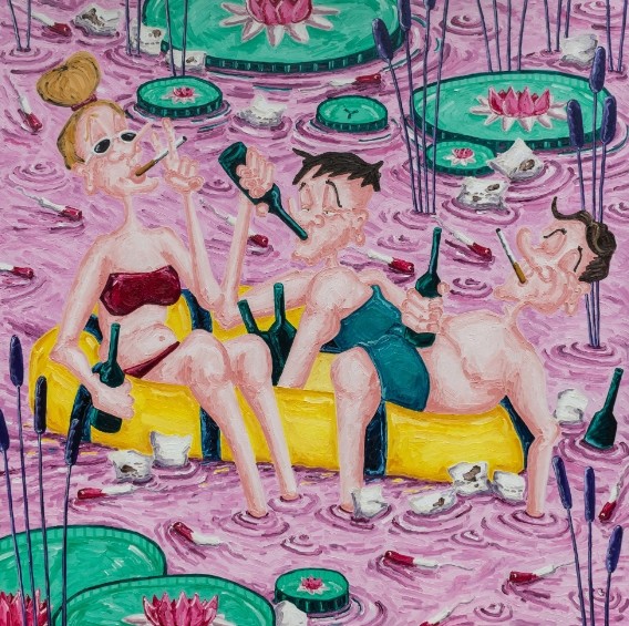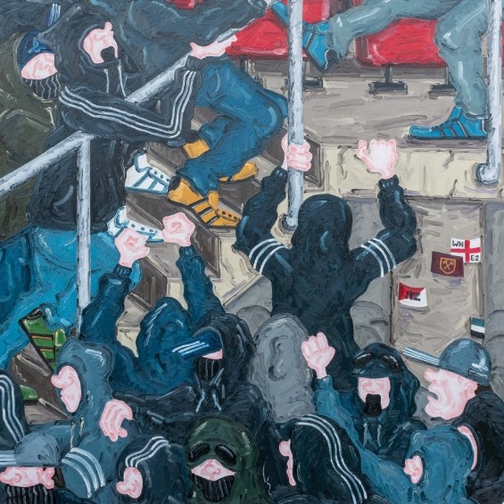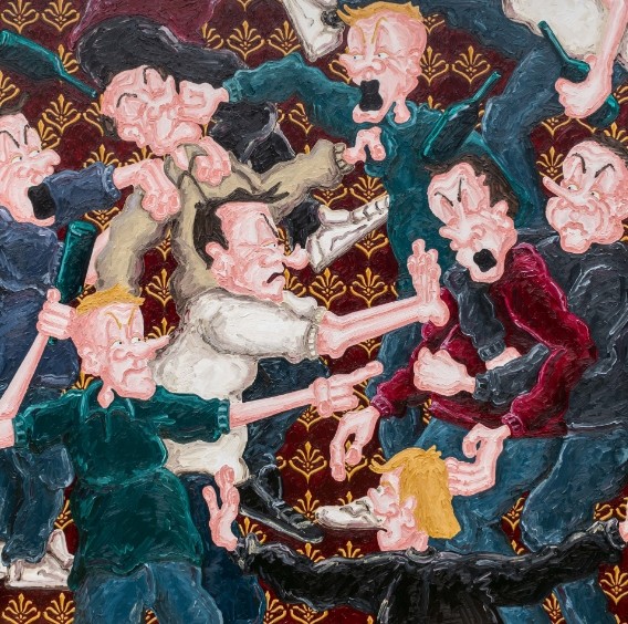 威廉·赫曼的这一系列作品可以看作是他过去一年的回忆日记,记录了足球赛或赛马等活动或社会和政治分歧与丑闻背景下的打斗和抗议。威廉根据新闻中的画面以及自己的经历描绘了他眼中的现实世界,是其对生活经历或当天见闻的直接回应。那些自称“帝国卫士”的团体戴着头巾和十字勋章,上街举行所谓的和平抗议,但往往以酒精引发的暴力冲突收场;“女士日”上盛装打扮出门的淑女,都会在庆典结束时醉醺醺“失了姿态”,跌跌撞撞回家;意在亲近自然的“懒人漂流”只是人们换个地方寻欢作乐,河中美景均沦为烟酒的陪衬。这些道貌岸然的群体活动,披着正经严肃的外皮开场,又总是戏剧性地以闹剧结尾,如此荒诞,又如此符合人间现实。毕竟,这一切都无简单的对错之分,因为人类好像总能合理化他们所做的一切。