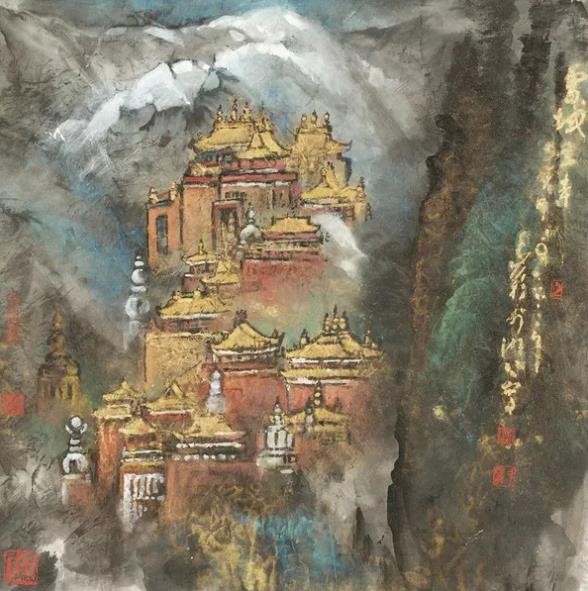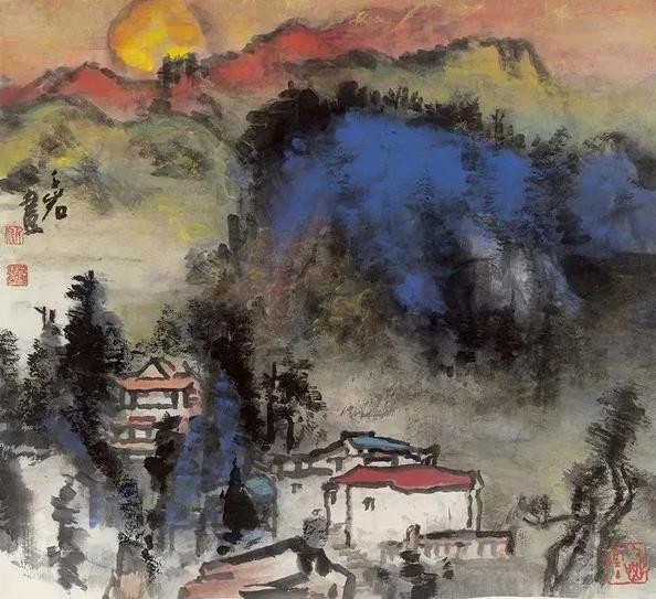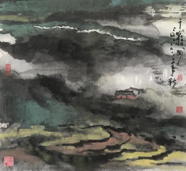 另一类主要发自西北之行,是黄宾虹“九墨”的综合,或可称为泼墨山水。其间用笔,设色、泼、破、渍、积,以及水的倾泼,浑然一体,几乎难分先后。它又见蕴藉,不同于张大千用笔与泼墨泼色的二分脱节,更不要说现时一般泼墨作品的浅薄。