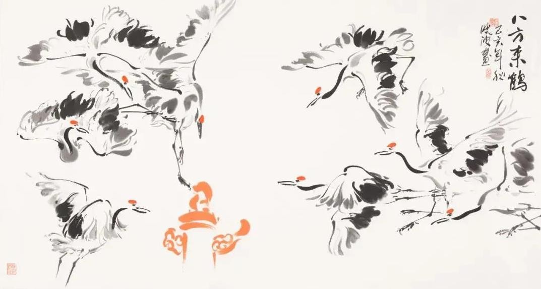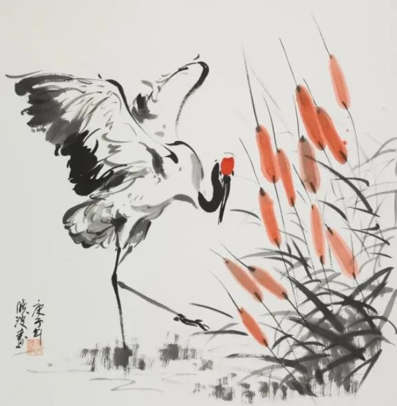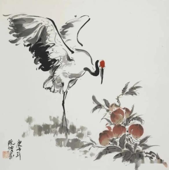 鲁晓波先生独爱仙鹤,意写其优美的形象和灵动的舞姿,表现其高贵如天使般的气质,彰显其高洁的品格。他的系列丹顶鹤灵动飘逸、清雅脱俗、仪姿万千。具有灵性而不矫的资质,自我清傲的风骨,是一个自由而充满生命力的自然观照。承继着中国文化的清逸之格,表达着中国绘画的写意之魂,延续着清华美院前辈艺术家设计与绘画并举的文风、文脉,并进入到人画相合、与自然相生的生命理想的追求之境。
