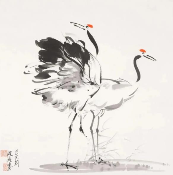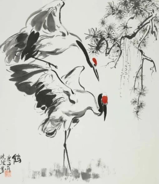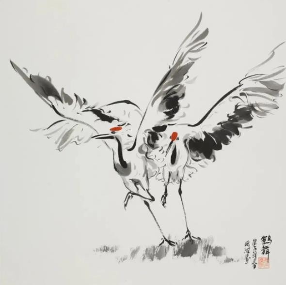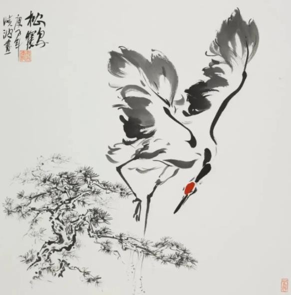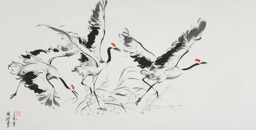 水墨淋漓中的鲁晓波是一位与鹤同行的雅逸之士,自由写心、自在放怀。他的系列丹顶鹤灵动不羁、骨骼清奇、风姿万千,是一部真我、本我的心灵之歌,又是一部大自然的组曲。鲁晓波注重一画,保持中锋用笔,长线条以S形出现,彰显着线条本身的律动,也使画面整体流动、活脱。用墨大胆,浓墨点染羽翅,灵透而不涩滞,也是他绘画的一大特色。刷刷点点中鹤的仙姿、逸态神采立现。独鹤清雅闲适,双鹤、群鹤凌波微步、举翼而逐、俯首而语、翩翩起舞、引颈高歌,互为交流、互为映衬、互为应答。它们相绕、凝视、呼唤、嬉戏、展翅、翱翔,似人间真情相依相恋,呼朋引伴,长喙和鸣,纯美、震撼,直抵心底。同时注重画面细节,酷爱摄影的他对丹顶鹤观察入微。