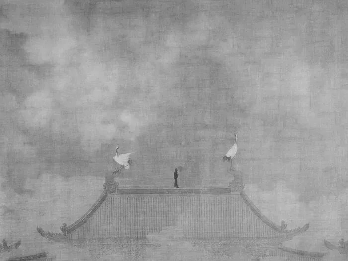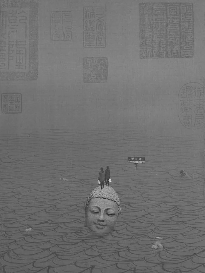 罗书杭的创作某种程度可以视为另一种题跋的方式,同样是后来者对前人画作的注解。只是题跋的内容不是以文学及书法,而是影像;也不是在原本作品的画面之外,而是嵌入到了画面之中。因此,原本的语境被化解了。在传统的山水画中,自然景象与人物融为一体,而且通常是一些文人雅士。罗书杭作品中出现的却是再普通不过的人:买菜的阿姨、做工的师傅、穿着睡衣的男子、站在山头的女学生……这些融入其中的现实影像,重新构建了一个语境,让传统与当代形成一种极具张力的矛盾。
