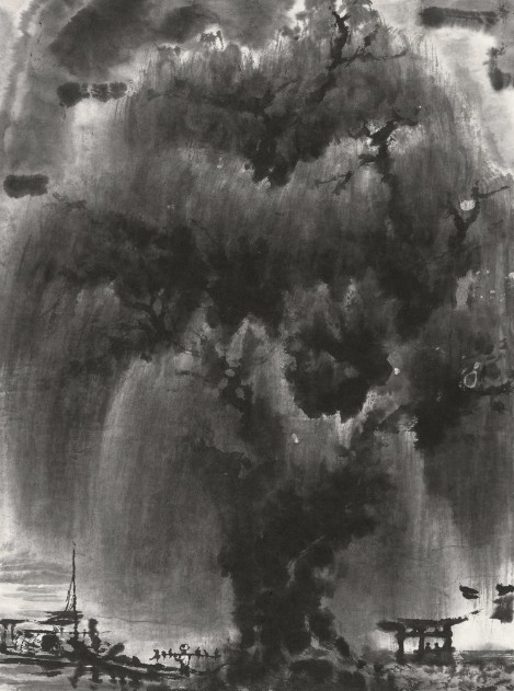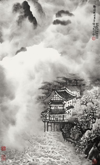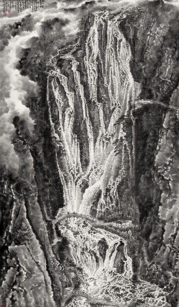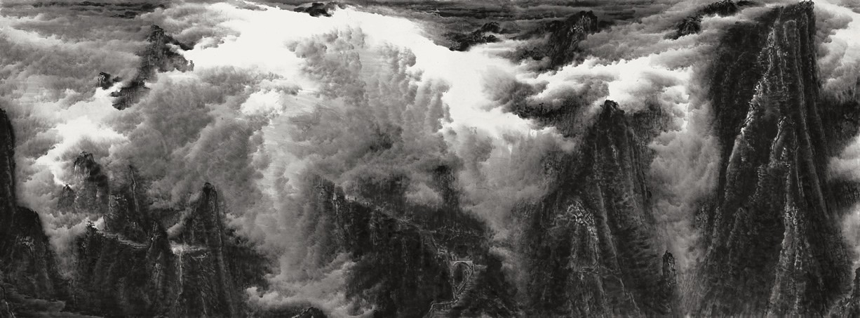来支钢的绘画底盘是中国画的水墨章法,其独到的表现手法是积墨技法,其理念追求的核心是墨象的原汁原味。其中,积墨之于他是极为重要的,积墨是他寻找到的一条他既心仪又适用的艺术途径,墨像的显现岂是仅仅笔力所致,当有心力运筹。古人云“墨分五色”,在我看来,何止是五色,实是“万紫千红”。墨有浓淡,深浅,厚薄,强弱,明暗,甚至还有力学上的度的张力,更不消说心神上的气势和贯通肺腑的荡气回肠。来支钢通过墨色的变化表现出物体的质感、量感、空间感,达到兼具视觉上与意境上两种维度的丰富。画面或淡薄如羽的白云,或厚实凝重的黑雾,或坚如磐石的崇山峻岭,或深邃无边的浩瀚空濛,把积墨技法运用得娴熟,把修养深厚禅理得省悟,雄浑之美和水灵之秀各具姿态,形象强劲而富有内力,技法成熟而又深邃其中,表现出中国画家所信奉并乐意表达的传统精要、文化精髓、中华精神和民族灵魂的诸多元素。放眼观去,他的作品好像由不得分说,画得中国画就像中国画,画得水墨画就像水墨画。一句话,中国画味道十足!对应一个中国画画家,坚守了中国画的旨意,保持了中国画的正道。在追求绘画的创新发展中,来支钢用他具象的墨色、墨形、墨意,传达出道法自然的水气、灵气、仙气,使其创作过程及其作品物我相融、形神皆备,力求于存在与意识的相知和相谐。作品有味,天高云淡飘逸劲爽,群山逶迤鸾漂凤泊,空灵静谧沉雄秀美,进而形成了秉持中国画精神、发挥水墨画优势、彰显表里和谐审美,并且属于他的“来式山水”。这种从常规化的、程式化的绘画传统中脱颖而出的化蝶与突破,无疑是符合艺术永恒创新发展的本质和规律的,作为一种尽显水墨张力的新兴绘画样式的展露,当可以看作为时代发展的产物和文明进步的结果,具有崭新的意义,可喜!