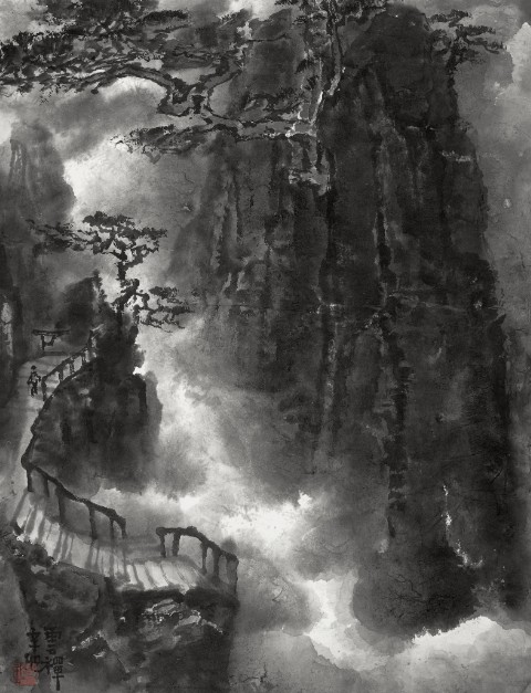 山水画是中国传统水墨画的一种,以描绘自然景色来实现古人的“澄怀观道”,试图把山水融入人的精神世界,追求“天人合一”的理想,写照出东方哲学的一种精神和韵味。来支钢的绘画所呈现出的气势和研理确乎达到一个高度和深度,体现出中国画所蕴含的内在精神和欲求表达的外在旨趣。从作品可以看出,他的创作有全身心的融入,有物我交流的过程,有潜意识、思想和观念的砥砺,融入了视觉(自然)的可见,截取了思维(哲思)的进步,添加了人文(文化)的增持,画里画外透出顺乎自然、超乎自然的入眼,具有既赏心悦目又有让人驻步端详的法力,如美味余香而令观者耐人寻味。从崇山峻岭的伟岸到云雾萦绕的烟云雾状,既是自然世界的借步写照,也是笔墨技法的灵活运用,更是心像臆造的感情抒发,这就对绘画进行了一个改造,一个由量到质的转变与提高,亦即从形而下的物理性的运动上升到形而上的精神性运动,体现出“美是理念的感性显现”(黑格尔语)的创作倾向和审美意义。他的画之所以耐看,还让人寻思,产生出审美的咀嚼不已,皆得益于所蕴藏的美学元素。