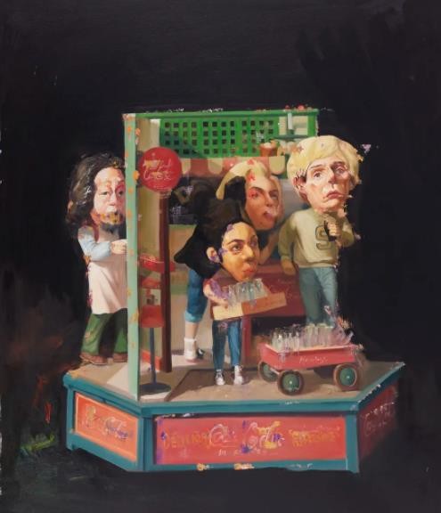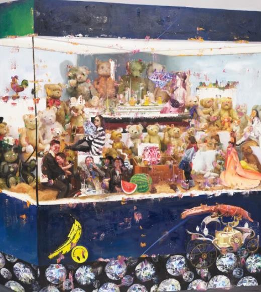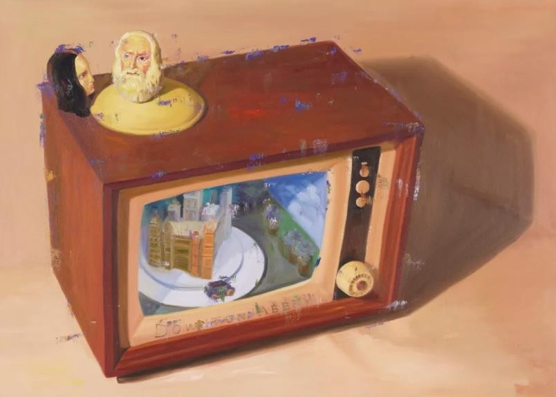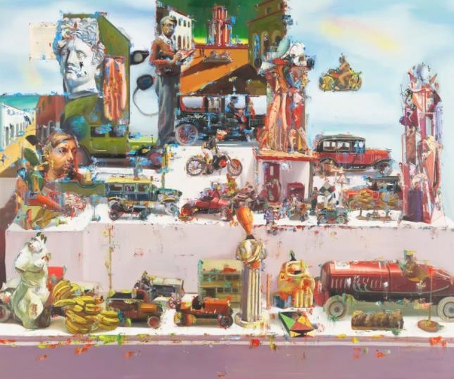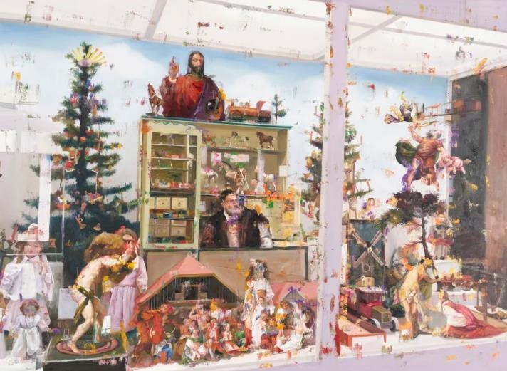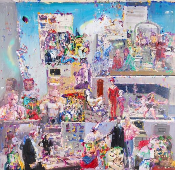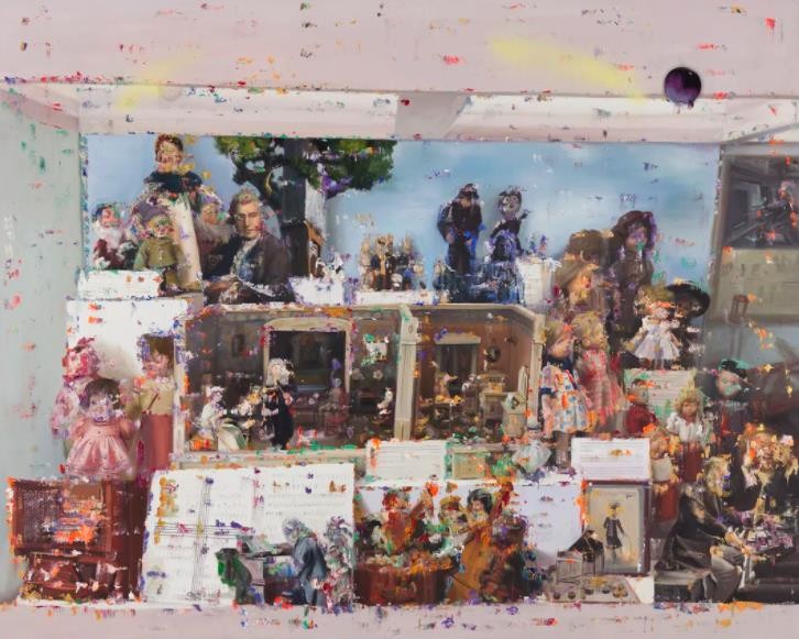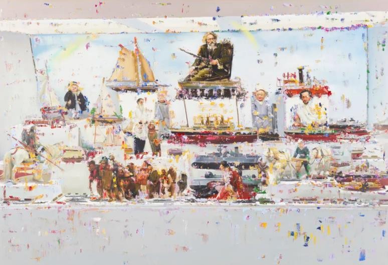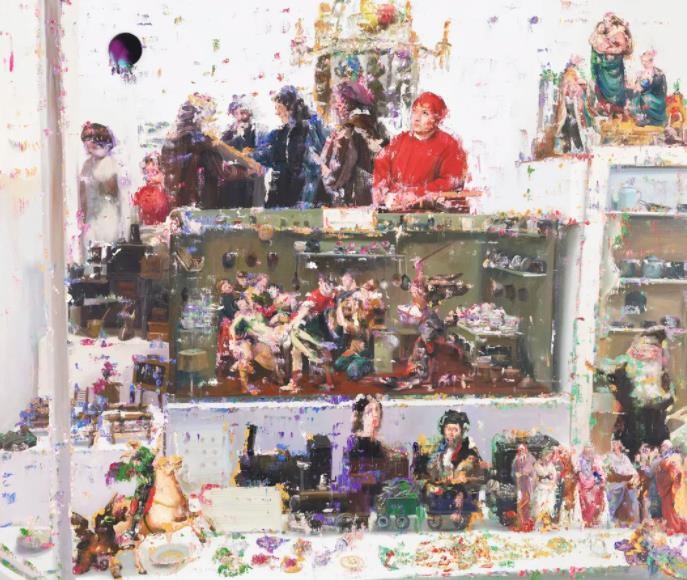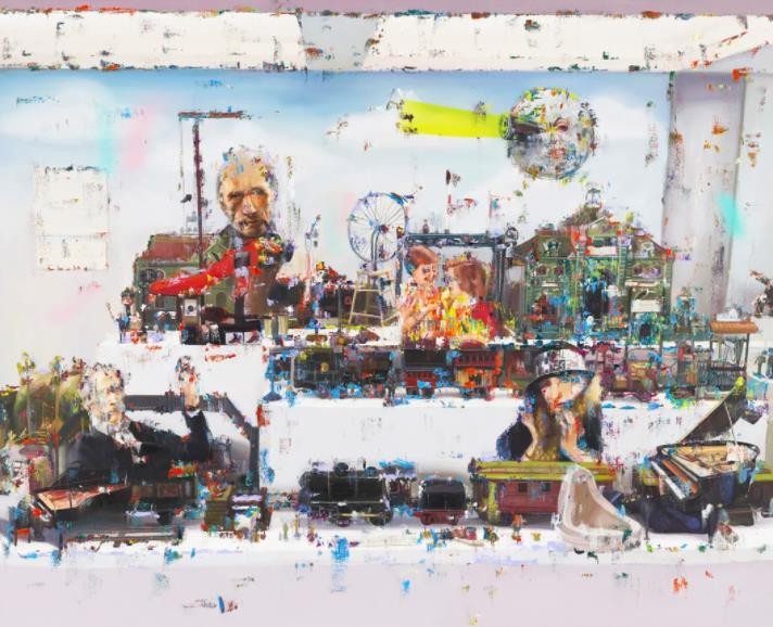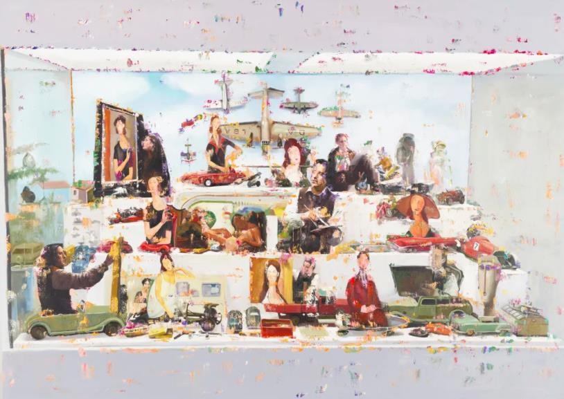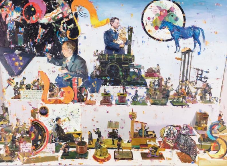 张钊瀛希望他的作品可以向人们言说,但从不一本正经地宣讲。如上所言,作为深受网络虚拟文化影响的一代,他戏谑地安排着图像的关系,虚拟出非现实的场景,呈现出莫名的荒诞感。他又有意地用干涩的、多色的笔触解构掉清晰的物象。这些笔触看起来和画中的时空毫无关系,就像是老照片表面的色斑,营造出来的却是一种与时空相疏离的异样感。这批绘画中,笔触对画面的“破坏”较之前有过之而无不及,使得本该坚固的物象结构松散了不少。因此“乐园”一词的使用带有修辞性质,它描述着一种非理性、非现实的时空状态。但“乐园”也有着具体的所指,这也是这批作品一个有意思的话题。每一幅画,每一个小雕塑,每一个老物件(以绘画进行再创作),都再现着一个看似真实的“乐园”。在《夏加尔的天翔梦》一画中,张钊瀛将夏加尔那些经典作品中的形象与其本人的形象并置在一个虚拟的双层展示台上,又以蒸汽时代的机器物件(蒸汽火车、火车站、铁架桥、怀旧路灯等)穿插其中。他又让夏加尔绘画中那些梦幻的飞翔者在展示台顶部悬空漂浮。这样的构图方式让人想起了汉代绘画中的天、地、人模式,它镜像般地引导着观者身临其境般在其中遨游。推而广之,对于观者而言,张钊瀛在这批作品中所塑造的“乐园”具备着双重的心理价值:水族馆式的外在凝视与镜像式的自我投射。对于中国观众而言,或许我们更愿意以第二种方式观看,想象自己成为“乐园”的参与者,这正体现出“可行、可游、可居”的古老艺术命题。