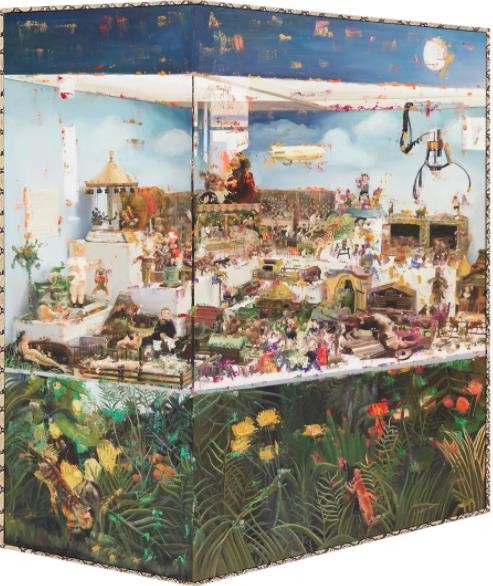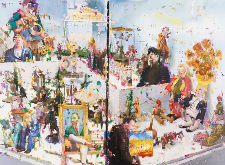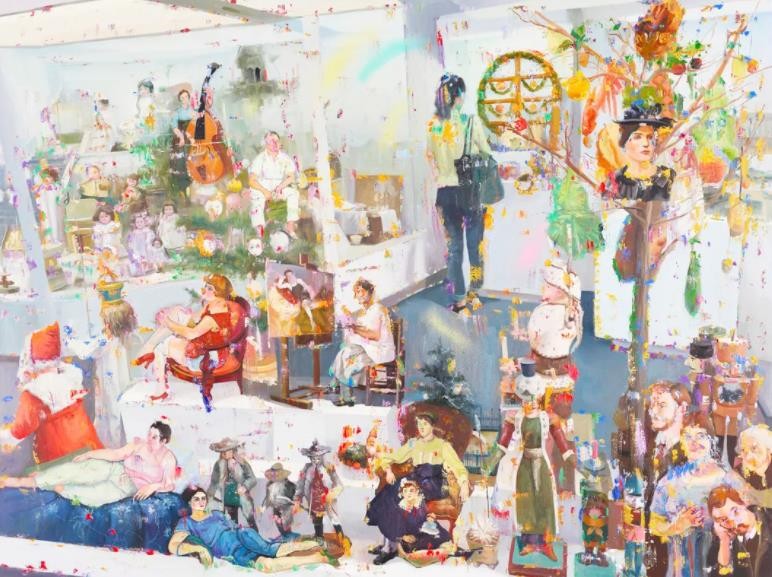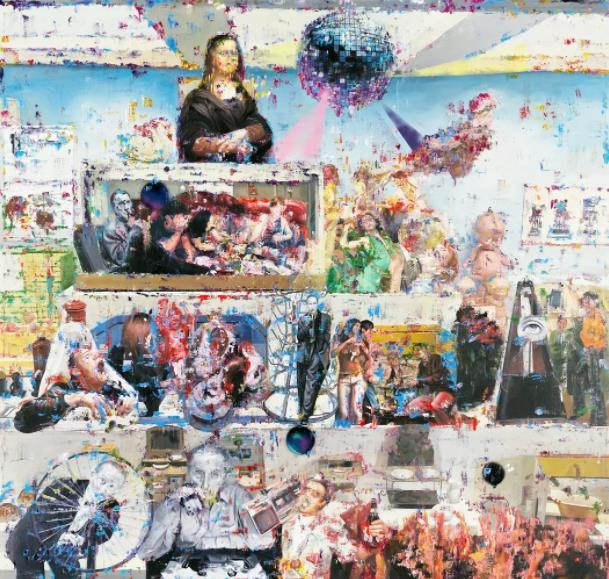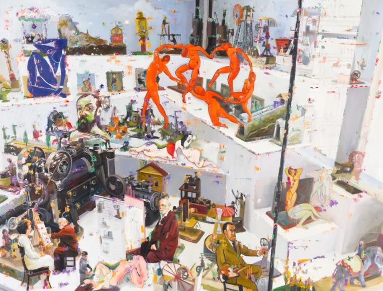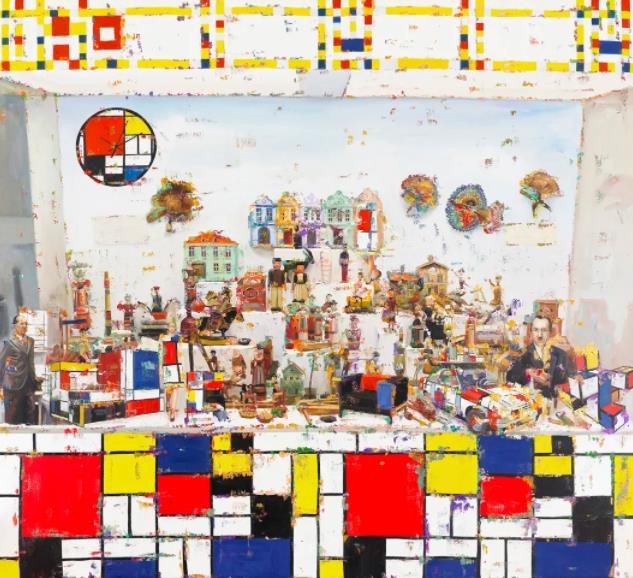 本次在上海艺博画廊举办的张钊瀛个展被命名为“终身学习—世界乐园”,是去年个展“终身学习”的续篇。“终身学习”表达着这位年轻艺术家对艺术史的敬意,他“恣意”挑选着那些经典图像,又戏谑地将其万花筒般呈现。“戏谑”是张钊瀛一贯的艺术特色,如今也不例外,因此可将其作品中虚拟的场景看作是“乐园”,或许此词还隐隐地致敬着15世纪荷兰画家博斯的《人间乐园》。加上“世界”这一定语,“世界乐园”体现出艺术家希望在作品中呈现出更广博的视野和更宏观的角度。用他自己的话说,“我们现在面对的世界跟以往不一样,所有的文化(思想、艺术、哲学)都是去地域、去边界的。正如我们不能抽离地讲中国,因为中国的话题也会辐射为世界的话题。”由此,在可动雕塑《艺术交谊舞》中,他让法国思想家萨特与留法的中国艺术家潘玉良等人同台而舞。这种“乱点鸳鸯谱”式的“点题”却似乎隐含着历史学中的全球视野。习惯了中西方历史分科学习的我们,实难在一念间意识到萨特、潘玉良等人在很长时间里竟然同处巴黎。不夸张地设想,或许他们真的曾经在某巴黎的某次舞会擦肩而过。