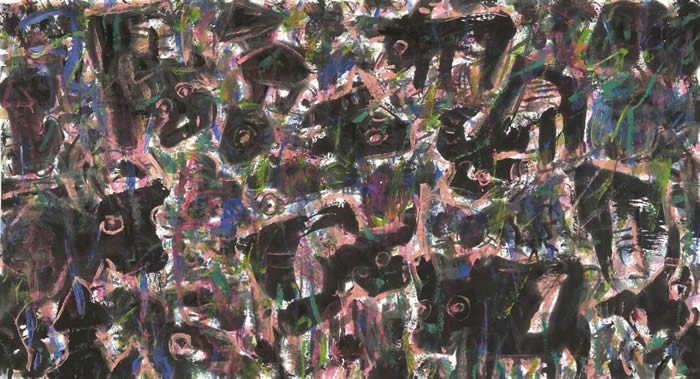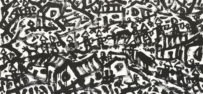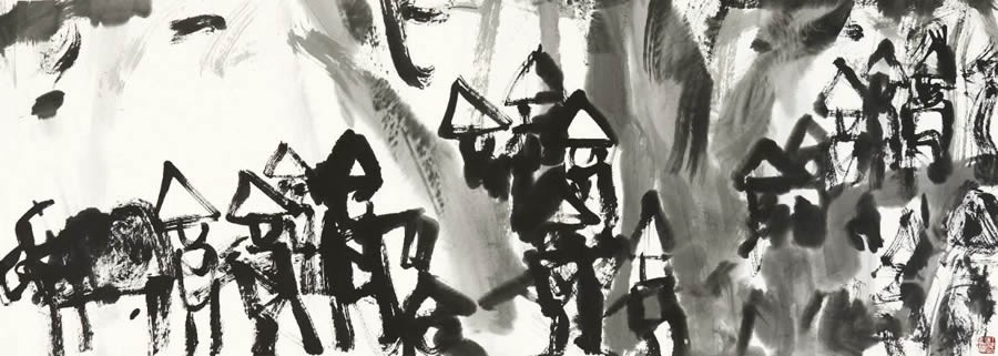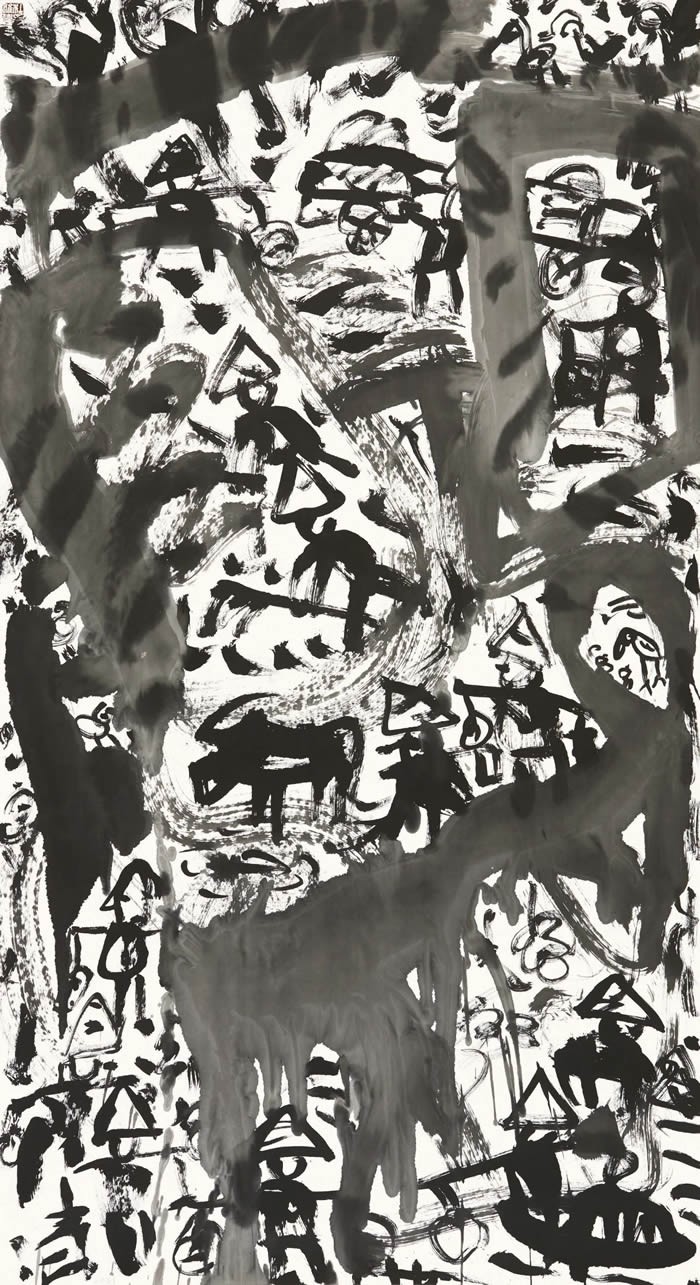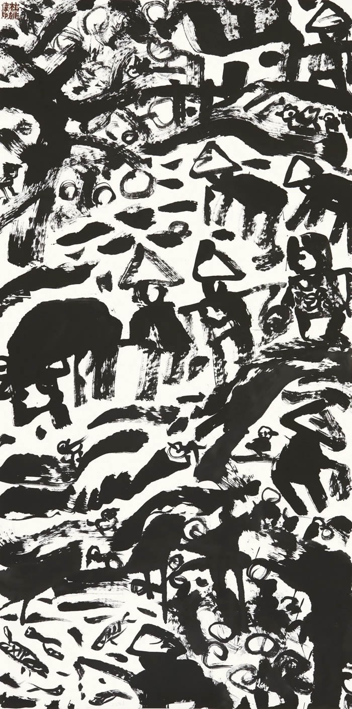 2007年下半年,进入不惑之年的杜雄伟决定逐步放下他最熟悉的版画创作,开始水墨实践。“版画是青春饭”这是很多版画人的自我调侃,这或许与版画制作的流程繁复,工序多、工时长,需要极大的体力付出有很大的关系。水墨媒材有即兴性,随机性、涂鸦性和便捷性,同时也保留着中国文化哲学的根性,尤利于闲暇处的抒发,故水墨画论中有“遣兴”一说,为即时表达开了方便之门。诸多原来从事西画创作的艺术家后来转向水墨是有其原因的,杜雄伟亦然。此次转向是杜雄伟对自身文化根性的再认识,开启了另一种语言维度的羁旅,同时为他的艺术和生活创造新的可能以及调整了两者的相处方式。十六年过去,杜雄伟的水墨创作一直坚守对乡土主题的抒写和表现,粗笔阔墨,借助版画经验的大黑白,大开合,穿插游走,粗犷笔触腾跃驻落处,苍莽野放,似是而非的种种形象,俯仰流转间,枯荣共生,充满“大田野”的磊落和放任。潮汕乡野的农民和炊烟,牛羊和家犬,灌木和老树,野草与荒塘成为杜雄伟水墨创作的主题,大胆豪放的落笔,淋漓粗拙的用墨,不事修饰而意趣盎然,生勐有力,对乡土的狂热之爱跃然纸上,热炽的乡土情怀倾注黑白之间。杜雄伟言道,每次到了乡间野地行走,精神为之解放,那是来自原生乡土的启悟,来自万物之灵地方神明的教示,自然万物遵循的是天理,社会人在服从于社会与人伦的规则中同样不可违背天理,当代人摆脱社会控制最有效的方式之一就是回到原生田园中重构并反思人的自然属性,在无限接近微尘中获得平视众生的角度,感受每种人世的卑微与伟大。