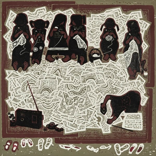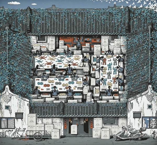 思想不被定式化,乐于尝试,敢于实践,青年时代的追求慢慢沉淀内化为个人品质,后面的三十多年里,杜雄伟一直坚持尝试和探索,敏感于社会转向和地方特定视觉的收集、整理和归纳,借鉴了西方版画的形式语言,作品更为沉实丰富,1988年创作了富有表现主义风格的《三个醉汉》(纸板版画),粗犷中带有几分憨态,热烈生动,1999年创作了以潮汕手工业为主题的作品《春天的故事系列·农家工厂之一》(套色木刻),画面汇聚了潮汕个体手工业的各种特点,四点金的院子,工作台井然排开,琳琅的玩具高低错落地垒放在流水线中,门口是出货和进货的人力三轮车,一辆代表着当年收入程度的“乌沙”摩托安静地停在门口一侧,特定时空气息浓烈。这是那个时代澄海最熟悉不过的场景,每个创业者利用各种可利用的条件和机会,无畏地打拼,谁都有盼头,每个人、每个家庭都保持着对未来的美好的期许。这件作品,我始终认为是反映澄海二十世纪九十年代生存实况最有代表性的现实主义作品,即使作品中糅合了装饰性,富有形式感,仍然保留着强烈的现实主义思想,为时代,为地方做出了精彩记录。2000年创作的《瓜棚》(丝网版画)系列,则充分利用电脑制图的便利性,把众多的文字缠绕在瓜棚的框架之内,视觉冲击力极强,揭示世纪之交的价值混乱以及话语的冲突,在保留着地方田园的视觉特征的同时弥散出时代精神诡异而荒诞的气息。多重技法,多种风格的作品,证明杜雄伟内在的不安分,不愿被定义,不随大流的愿心再次让他的思想摆脱了地方性的侵蚀、束缚和训诫。