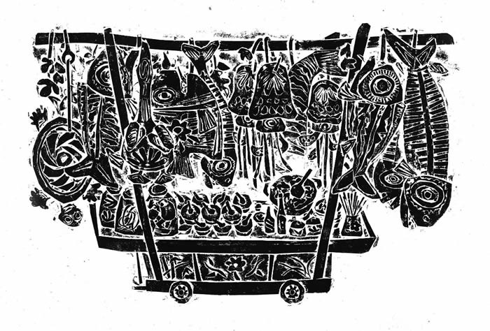 做出选择的杜雄伟全身心投入到版画创作中,在《温泉》(黑白木刻)、《小花场》(套色木刻)、《小食摊》(纸板版画)等佳作正是诞生在这一时期,作品构图饱满,形象简朴大气,富有浓郁的青春气息和对生活的热切之情,时代正在自我矫正,人们的情感因社会的思想解放变得更为丰富,敢于表达也善于表达,个性的觉醒让艺术家可以把更为饱满的情感投注到日常之中,贴近地方现实,图像富有地方特点。作品参加了许多全国性的展览,那个年代,能参加全国美展是很多艺术青年的梦想,因其筛选机制极为严格,也比较公正客观,难度颇大,参展是一种嘉许,也是对创作的肯定,必然是极大的激励。