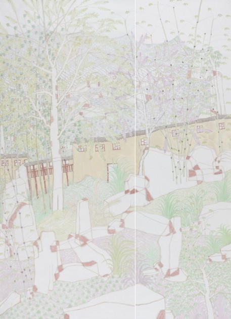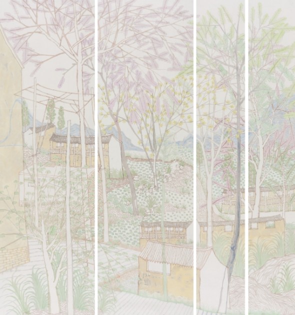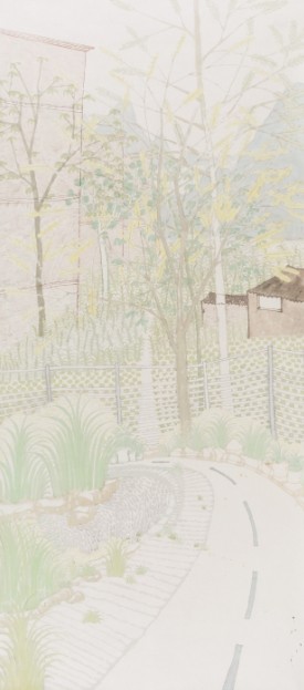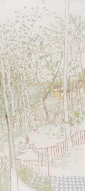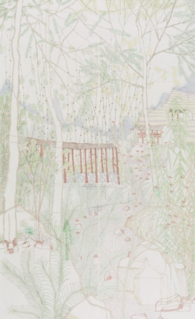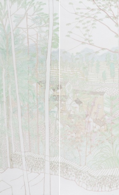 几年前,玉杰离开南方那个温暖的城市,只身一人来到北京,只因为她喜欢画画,而这里有许多和她同样喜欢画画的人,有许多和画画有关的事。 玉杰从小生活在闽北的一个小山村里,那里有山,有水,有农田,有乡间小道。还有各种各样的植物和树木。清晨鸟鸣,夜里蛙声,生活简单而质朴。玉杰用淡淡的点、线和色块画她记忆中的家乡,我们常常可以在她的画面上看到充满活力的绿树,有节奏感的农田,形态优雅的山坡,其间也常常穿插着留白并通向远方的路。这是一个弥漫着温柔气息的地方,在干净和清新的画面上泛出些许寂寥和平静。她有一种天生的控制画面的能力,喜欢大幅的画面,那些树在她的笔下因为有了八尺丈二的空间随意而自在地生长着,令人感受到一种生命蓬勃的气息。然而这样一个五彩斑斓的景象却勾勒出一个静谧、平和又略带孤寂的田园风光,我想这不仅仅是她对于家乡的记憶,也是她置身于自己身边的现实世界自然流露出来的自我情感。意境依然是传统的,而手法却更多出自直觉。她以这样一种浪漫的叙事方式思考着现实生活,演绎自己的内心存在,那里有一条留白却通向远方的路。
