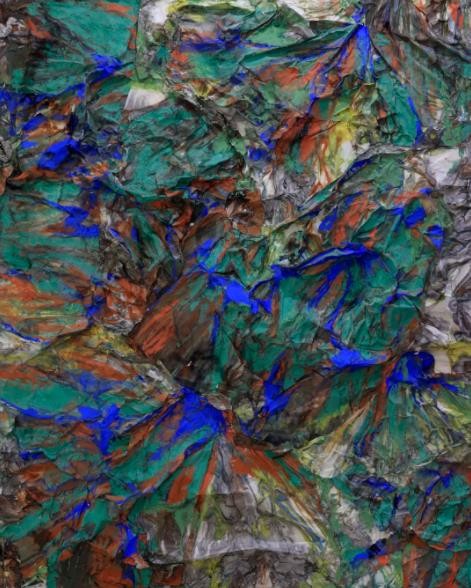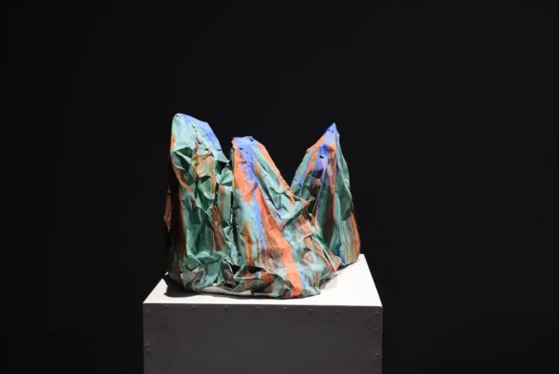中国的青绿山水是一种不同于水墨的独特的文化符号,它所包含的石青、石绿、赭色等同样是一种具有符号性的标识。洪波的这样一种装置对于其山水的意义,是一种古与今的对话,是用今天的装置来对话传统的水墨,是用青绿来诠释墨分五彩。这样一种对话所表现出来的文化意义,既有文化传承中的矛盾和对立,也有文化传统中的继承与发展,其核心依然是在山水范畴之内来延展它的表现和美学意义。所以,当这些作品呈现在一个展厅中的时候,或者呈现在不同空间中的时候,所呈现的又是另外一种特别的空间和结构的关系,这就是不同于“写”装置,就是远离绘画而接近于雕塑的装置。