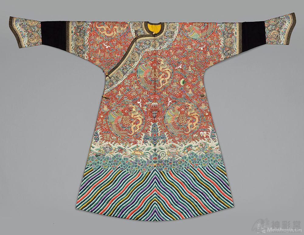 第一部分主题是「大婚」,展现皇室婚礼用品,如光绪时期隆裕皇后出嫁时穿过的红色吉服袍,以及双喜金如意、红珊瑚手串、翡翠坠等;